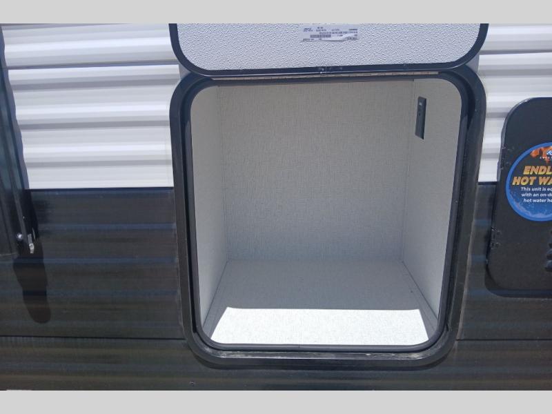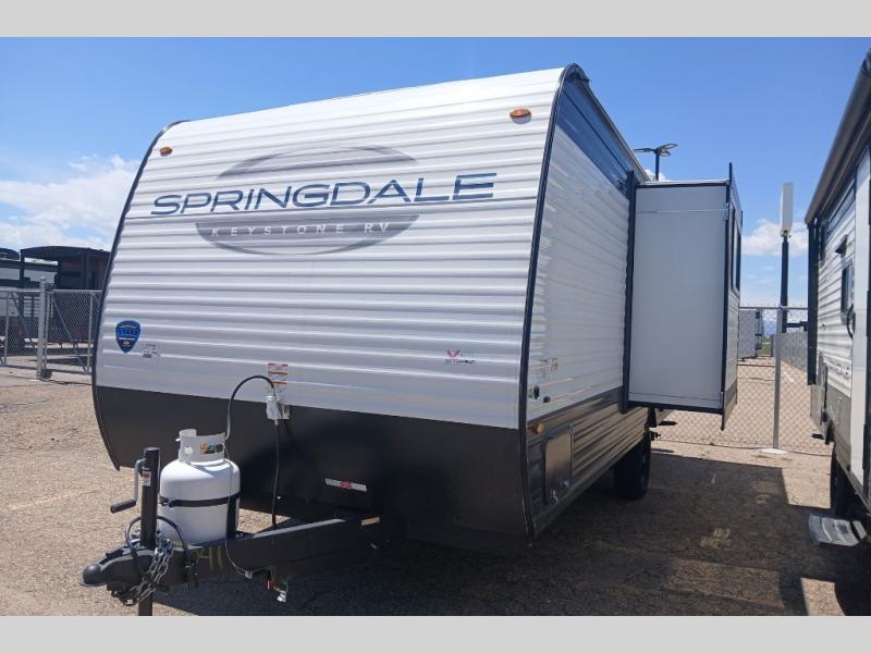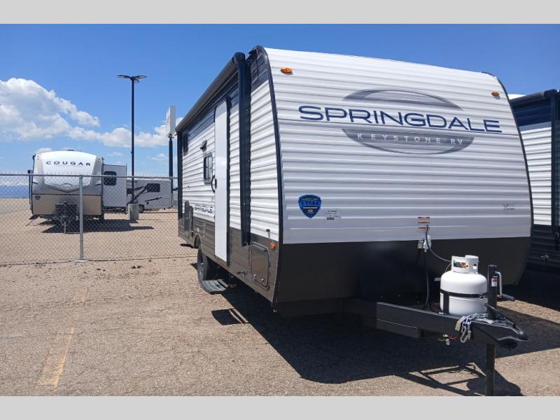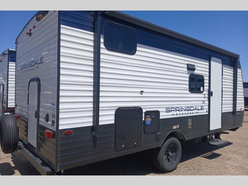 With any Springdale Classic Mini travel trailer by Keystone, you will enjoy lightweight towing thanks to their single-axle! You'll find the XL entry assist handle will make entering and exiting your unit easier than ever, and the power awning will provide protection from the sun as you relax in your camp chairs outside. Each model includes blackout night shades, solid wood cabinet doors and drawers, a shower skylight for more standing room, plus many more interior comforts. There is also a 5,000 BTU sidewall A/C and 20K BTU furnace to keep you comfortable, plus a Girard tankless water heater for endless hot showers!
