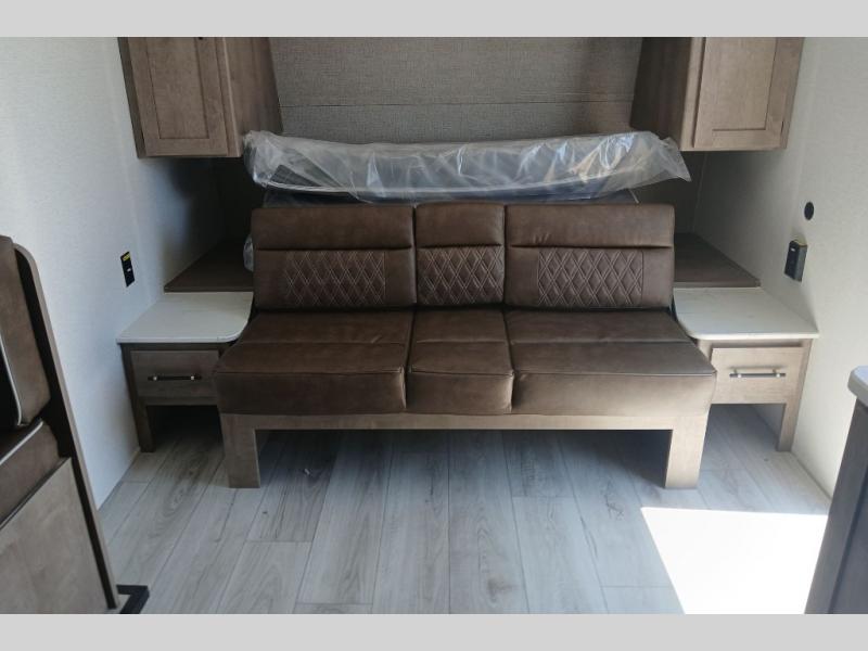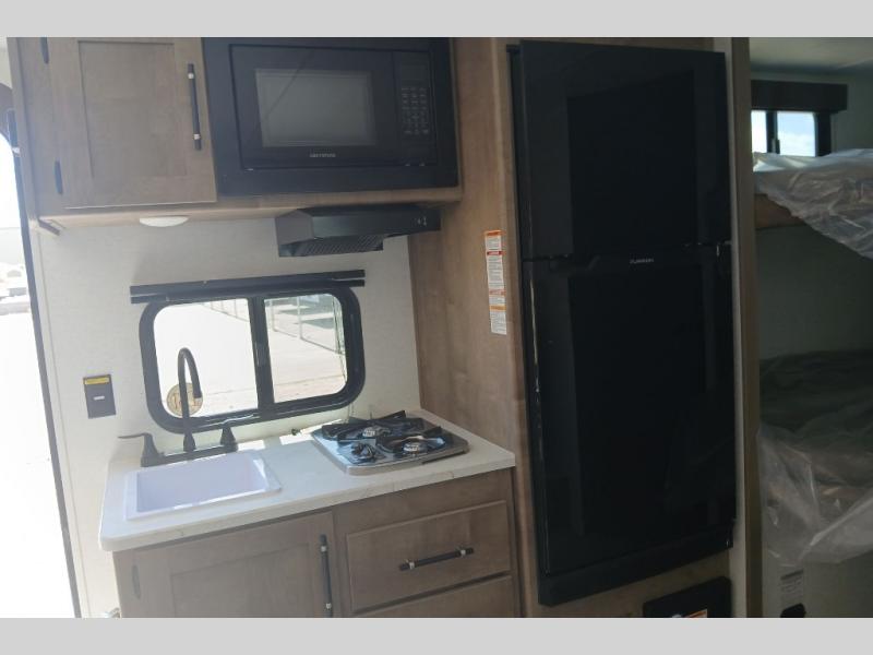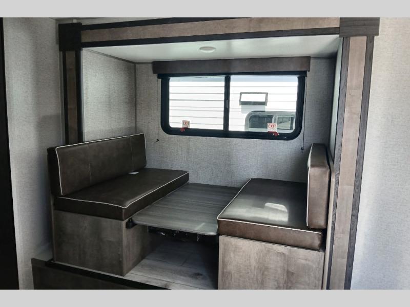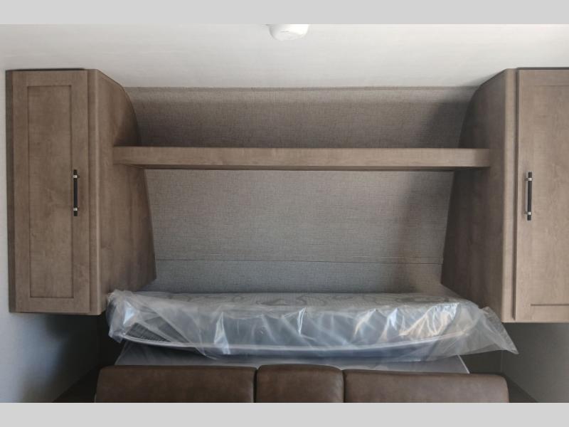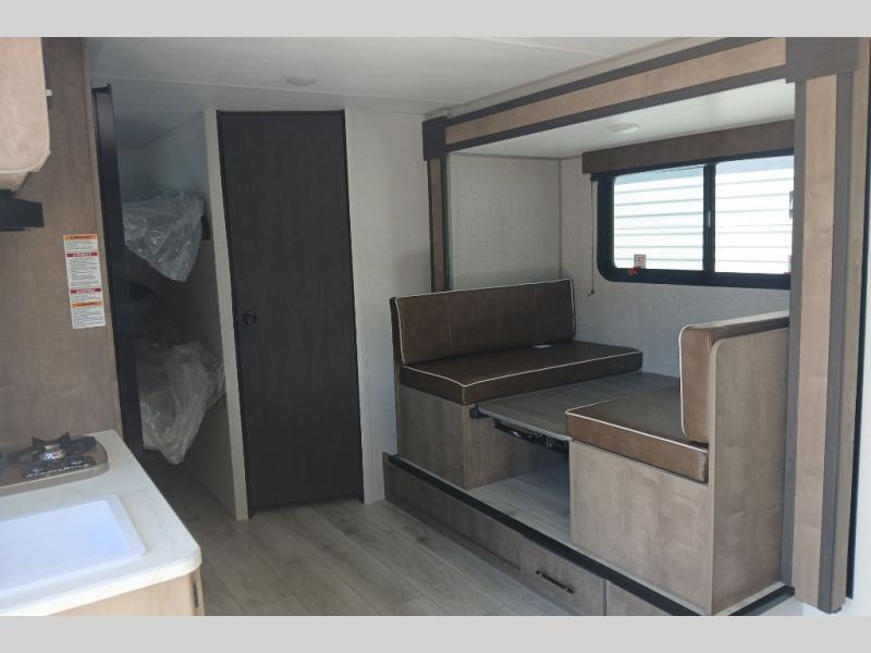 This cute Springdale Classic Mini bunk model will easily sleep seven with the double-size bunks, booth dinette slide, and queen Murphy bed which features a fold-down sofa at the end. During the daytime, you can have the seating you need and want, and at night the sofa folds to become part of the front bed. The rear corner bath is convenient and features a tub/shower, toilet, and sink. The kitchen is fully equipped to allow you to cook as you travel. Enjoy them while under the 15' power awning. A handy pass-thru storage compartment up front offers ample space for camp equipment, and there is additional storage accessible beneath the bunk in back.