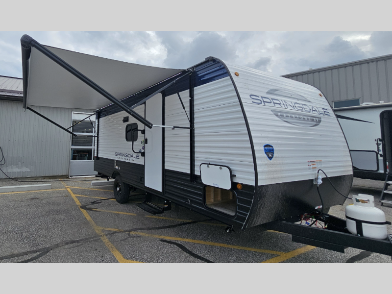 With any Springdale Classic Mini travel trailer by Keystone, you will enjoy lightweight towing thanks to their single-axle! You'll find the XL entry assist handle will make entering and exiting your unit easier than ever, and the power awning will provide protection from the sun as you relax in your camp chairs outside. Each model includes blackout night shades, solid wood cabinet doors and drawers, a shower skylight for more standing room, plus many more interior comforts. There is also a 5,000 BTU sidewall A/C and 20K BTU furnace to keep you comfortable, plus a Girard tankless water heater for endless hot showers!