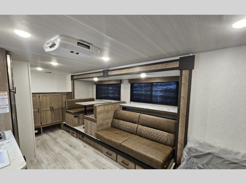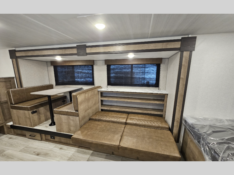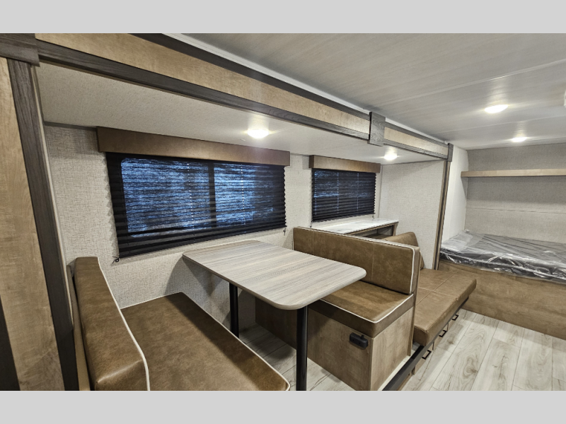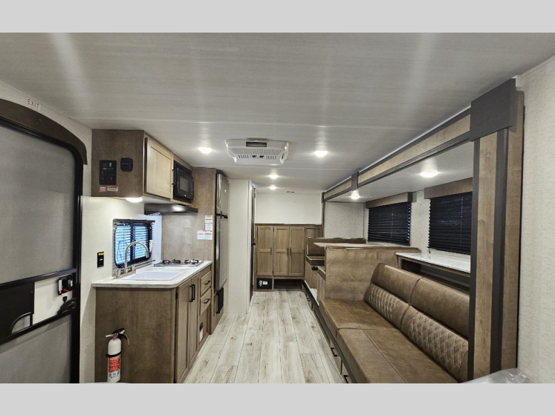 When you want to explore the outdoors and relax indoors, this trailer will provide the comforts, conveniences and many of the wants you will need to do both! The interior is spacious with the large slide out which includes a booth dinette and sofa, both with storage drawers. And the furniture doubles as sleeping space when you have overnight guests. There is a pantry and a closet next to the full bathroom which is handy, and the galley kitchen offers a 7.7 cu. ft. 12V refrigerator to store the cold items. You will also sleep soundly each night on the front queen bed. The exterior offers a 15' power awning plus a pass-thru compartment for your outdoor camping chairs, tables, charcoal and more.