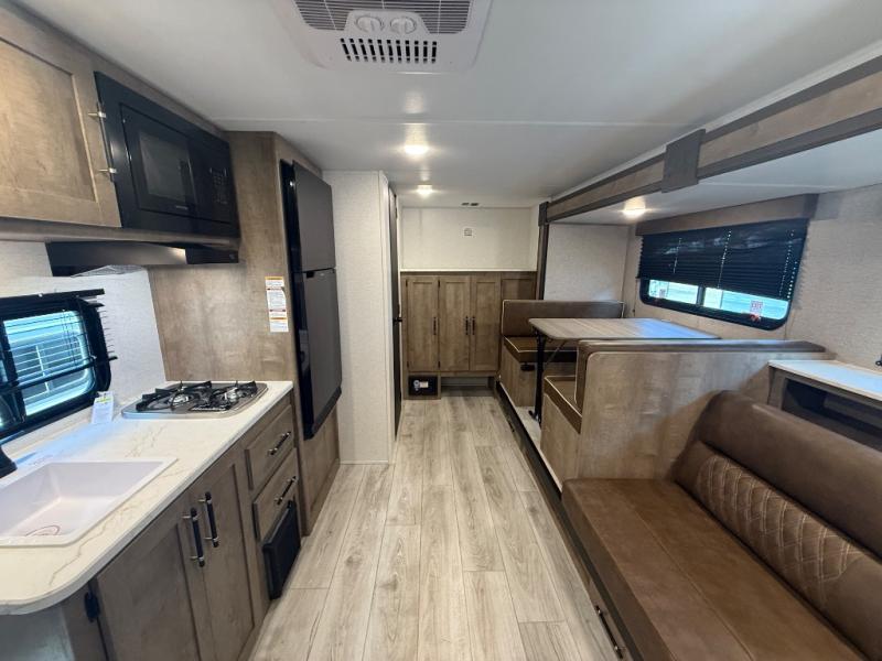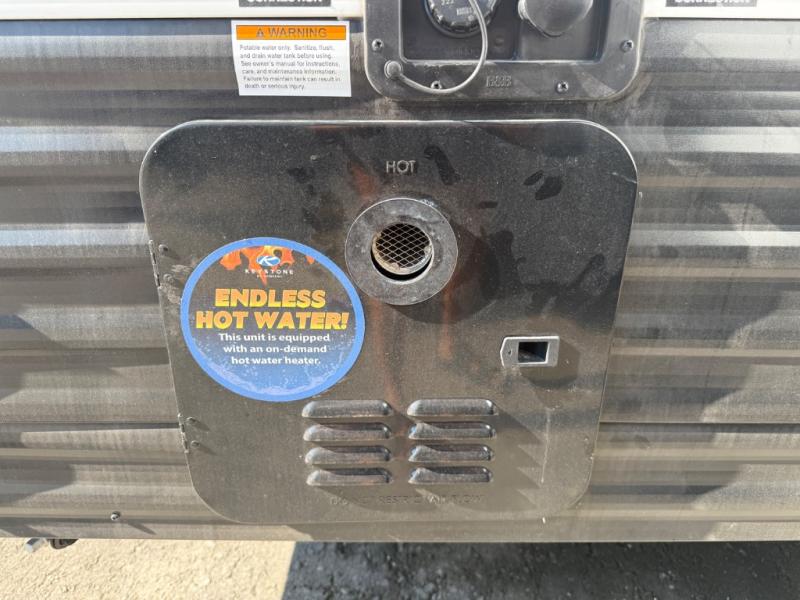 When you want to explore the outdoors and relax indoors, this trailer will provide the comforts, conveniences and many of the wants you will need to do both! The interior is spacious with the large slide out which includes a booth dinette and sofa, both with storage drawers. And the furniture doubles as sleeping space when you have overnight guests. There is a pantry and a closet next to the full bathroom which is handy, and the galley kitchen offers a 7.7 cu. ft. 12V refrigerator to store the cold items. You will also sleep soundly each night on the front queen bed. The exterior offers a 15' power awning plus a pass-thru compartment for your outdoor camping chairs, tables, charcoal and more.
