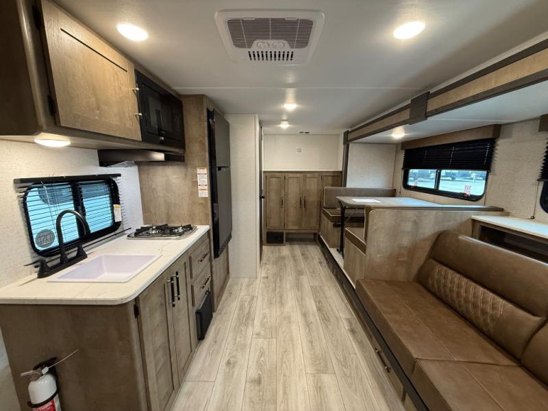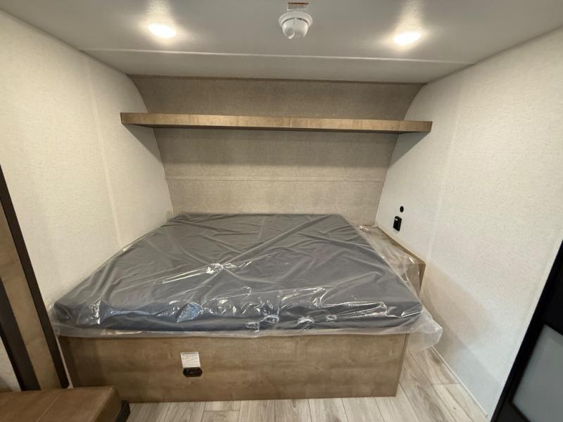 When you want to explore the outdoors and relax indoors, this trailer will provide the comforts, conveniences and many of the wants you will need to do both! The interior is spacious with the large slide out which includes a booth dinette and sofa, both with storage drawers. And the furniture doubles as sleeping space when you have overnight guests. There is a pantry and a closet next to the full bathroom which is handy, and the galley kitchen offers a 7.7 cu. ft. 12V refrigerator to store the cold items. You will also sleep soundly each night on the front queen bed. The exterior offers a 15' power awning plus a pass-thru compartment for your outdoor camping chairs, tables, charcoal and more.