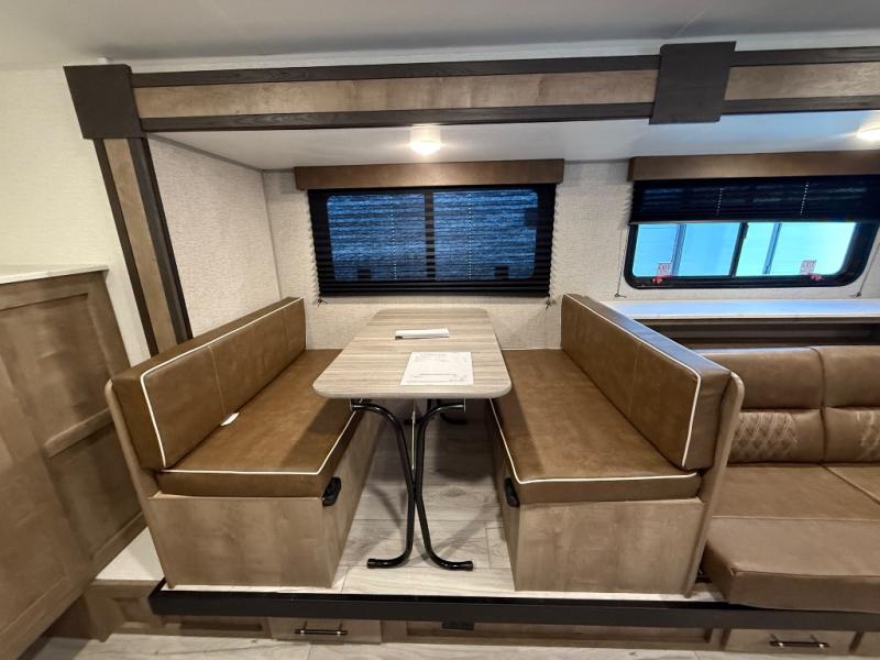 When you want to explore the outdoors and relax indoors, this trailer will provide the comforts, conveniences and many of the wants you will need to do both! The interior is spacious with the large slide out which includes a booth dinette and sofa, both with storage drawers. And the furniture doubles as sleeping space when you have overnight guests. There is a pantry and a closet next to the full bathroom which is handy, and the galley kitchen offers a 7.7 cu. ft. 12V refrigerator to store the cold items. You will also sleep soundly each night on the front queen bed. The exterior offers a 15' power awning plus a pass-thru compartment for your outdoor camping chairs, tables, charcoal and more.