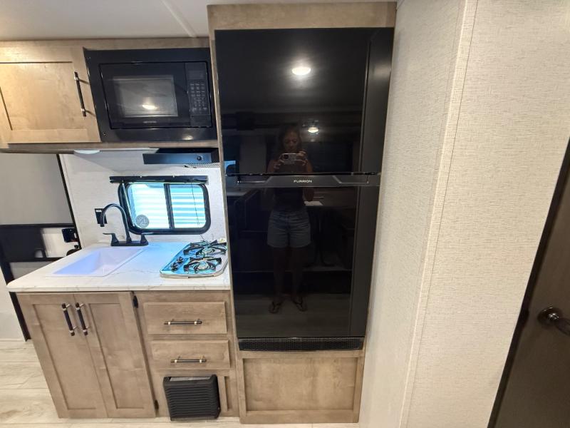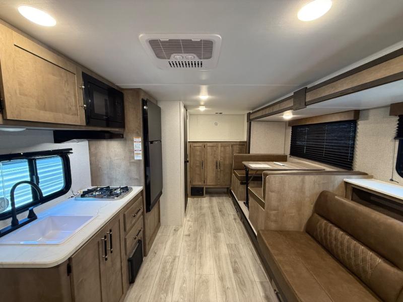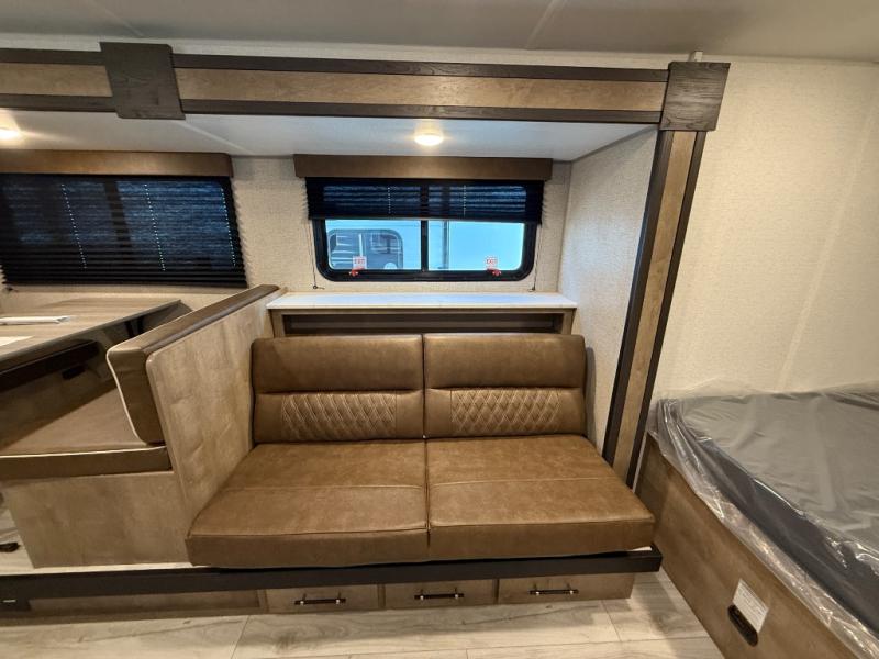 When you want to explore the outdoors and relax indoors, this trailer will provide the comforts, conveniences and many of the wants you will need to do both! The interior is spacious with the large slide out which includes a booth dinette and sofa, both with storage drawers. And the furniture doubles as sleeping space when you have overnight guests. There is a pantry and a closet next to the full bathroom which is handy, and the galley kitchen offers a 7.7 cu. ft. 12V refrigerator to store the cold items. You will also sleep soundly each night on the front queen bed. The exterior offers a 15' power awning plus a pass-thru compartment for your outdoor camping chairs, tables, charcoal and more.