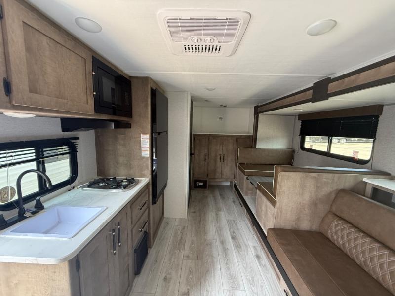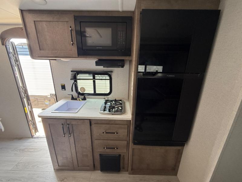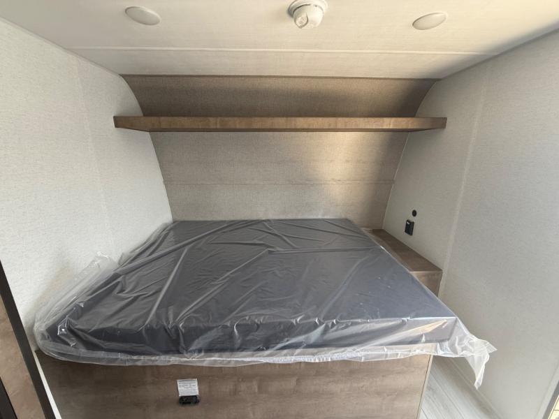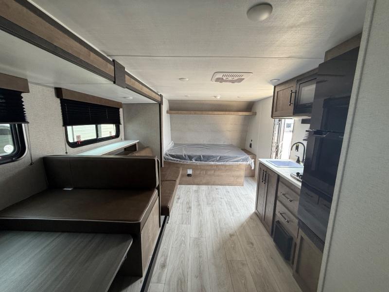 When you want to explore the outdoors and relax indoors, this trailer will provide the comforts, conveniences and many of the wants you will need to do both! The interior is spacious with the large slide out which includes a booth dinette and sofa, both with storage drawers. And the furniture doubles as sleeping space when you have overnight guests. There is a pantry and a closet next to the full bathroom which is handy, and the galley kitchen offers a 7.7 cu. ft. 12V refrigerator to store the cold items. You will also sleep soundly each night on the front queen bed. The exterior offers a 15' power awning plus a pass-thru compartment for your outdoor camping chairs, tables, charcoal and more.