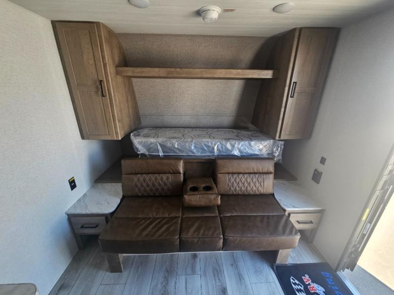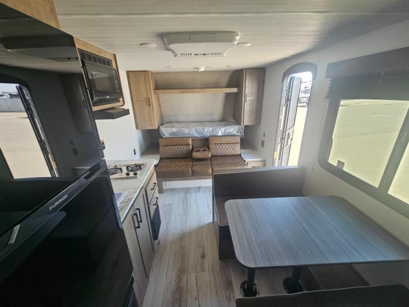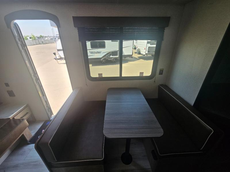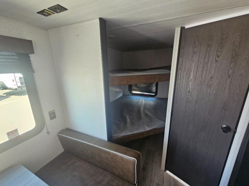 This cute Springdale Classic Mini bunk model will easily sleep seven with the double-size bunks, booth dinette, and queen Murphy bed which features a fold-down sofa at the end. During the daytime, you can have the seating you need and want, and at night the sofa folds to become part of the front bed. The rear corner bath is convenient and features a tub, toilet, and sink. The kitchen is fully equipped to allow you to cook as you travel, and you can enjoy meals while under the 15' power awning.