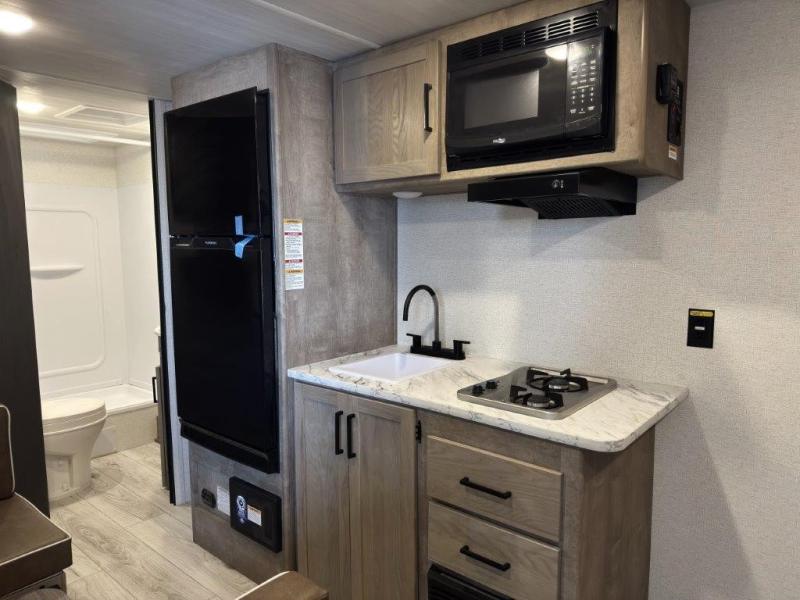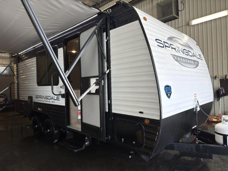 With any Springdale Classic Mini travel trailer by Keystone, you will enjoy lightweight towing thanks to their single-axle! You'll find the XL entry assist handle will make entering and exiting your unit easier than ever, and the power awning will provide protection from the sun as you relax in your camp chairs outside. Each model includes blackout night shades, solid wood cabinet doors and drawers, a shower skylight for more standing room, plus many more interior comforts. There is also a 5,000 BTU sidewall A/C and 20K BTU furnace to keep you comfortable, plus a Girard tankless water heater for endless hot showers!