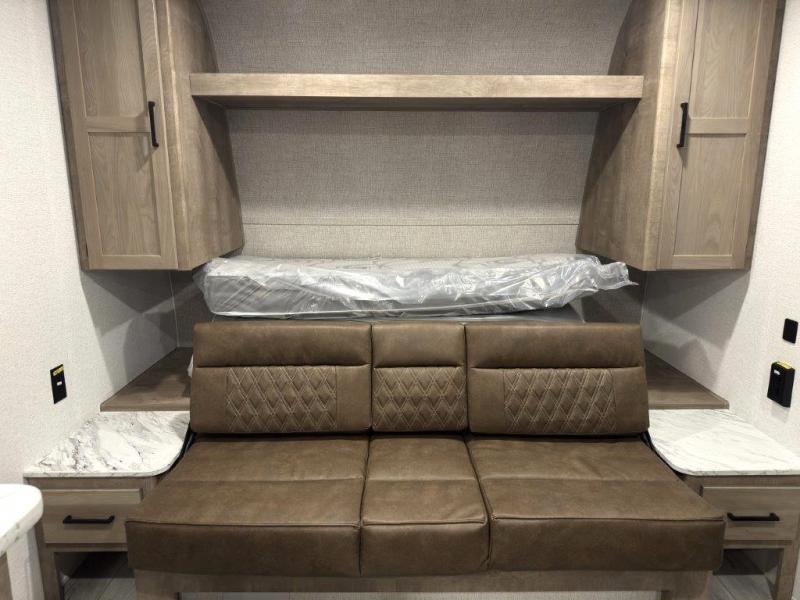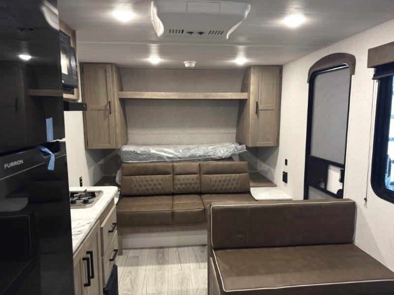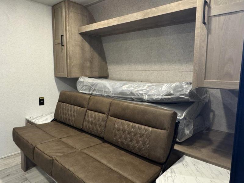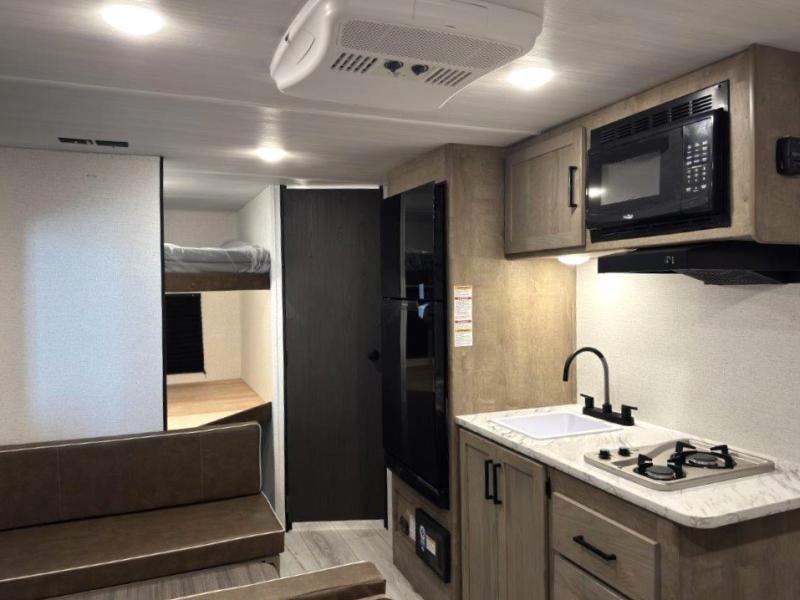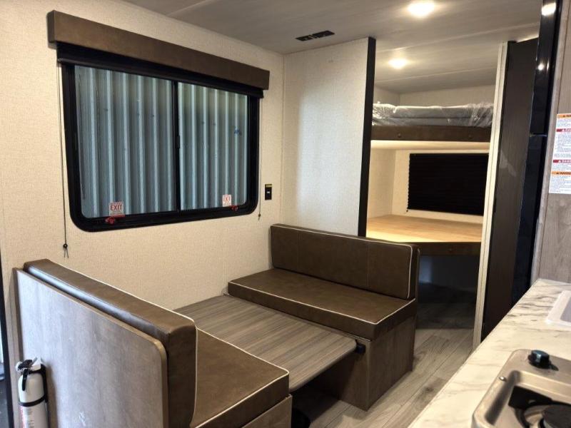 This cute Springdale Classic Mini bunk model will easily sleep seven with the double-size bunks, booth dinette, and queen Murphy bed which features a fold-down sofa at the end. During the daytime, you can have the seating you need and want, and at night the sofa folds to become part of the front bed. The rear corner bath is convenient and features a tub, toilet, and sink. The kitchen is fully equipped to allow you to cook as you travel, and you can enjoy meals while under the 15' power awning.