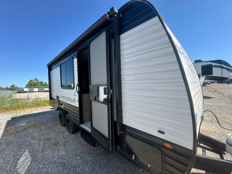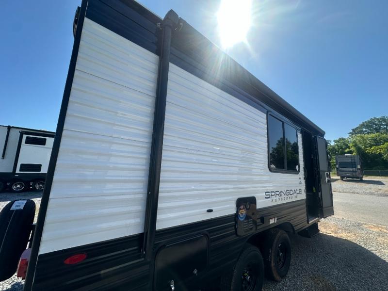 With any Springdale Classic Mini travel trailer by Keystone, you will enjoy lightweight towing thanks to their single-axle! You'll find the XL entry assist handle will make entering and exiting your unit easier than ever, and the power awning will provide protection from the sun as you relax in your camp chairs outside. Each model includes blackout night shades, solid wood cabinet doors and drawers, a shower skylight for more standing room, plus many more interior comforts. There is also a 5,000 BTU sidewall A/C and 20K BTU furnace to keep you comfortable, plus a Girard tankless water heater for endless hot showers!