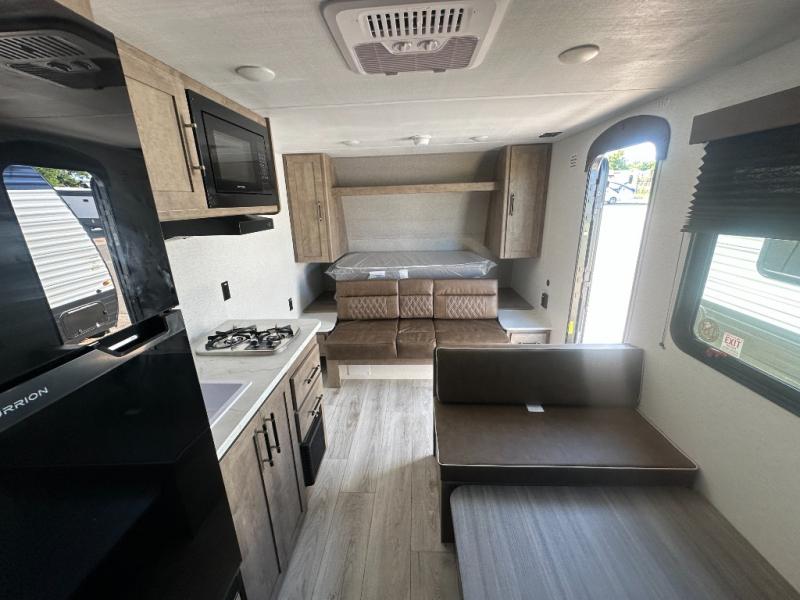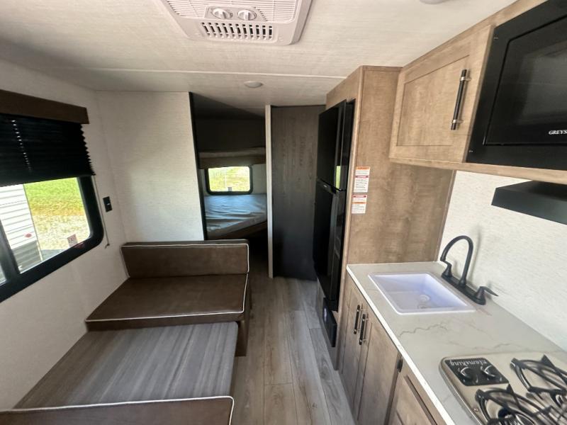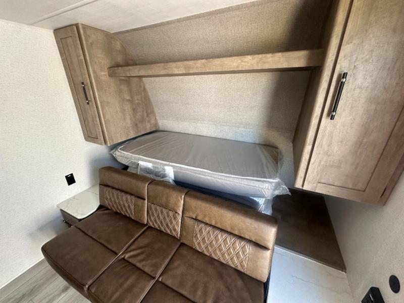 This cute Springdale Classic Mini bunk model will easily sleep seven with the double-size bunks, booth dinette, and queen Murphy bed which features a fold-down sofa at the end. During the daytime, you can have the seating you need and want, and at night the sofa folds to become part of the front bed. The rear corner bath is convenient and features a tub, toilet, and sink. The kitchen is fully equipped to allow you to cook as you travel, and you can enjoy meals while under the 15' power awning.