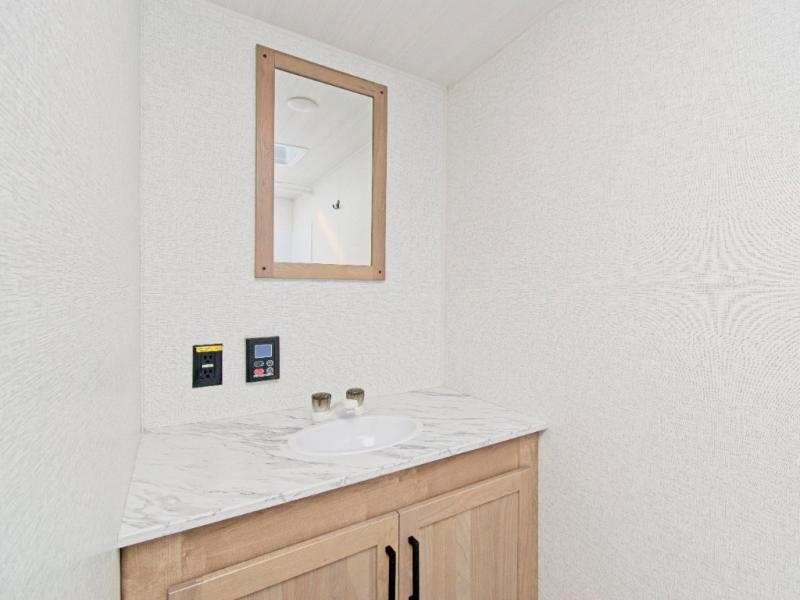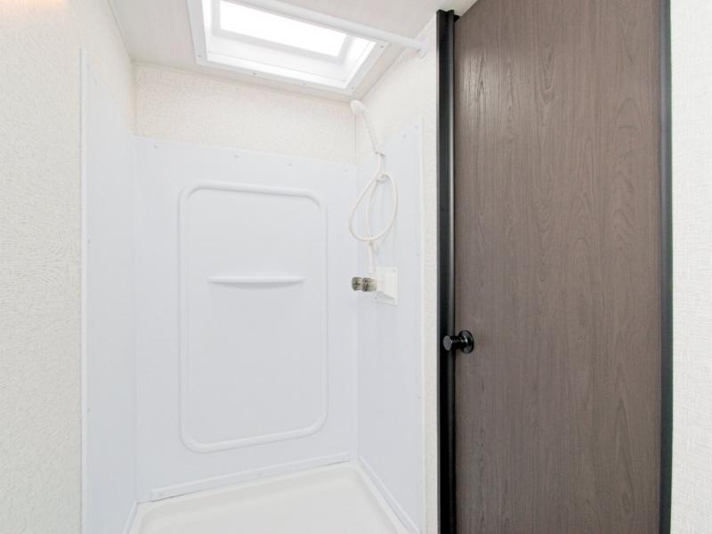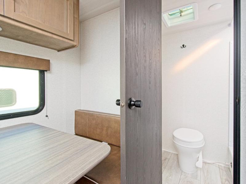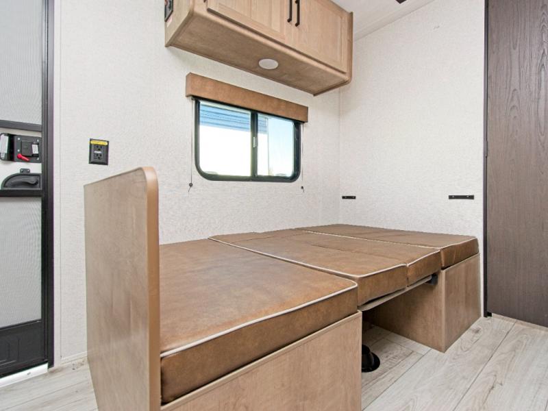 Inside, you'll find a queen bed with dual closets and nightstands, plus overhead storage for your gear. The booth dinette offers a cozy spot for meals and can convert into additional sleeping space for guests. The rear full bathroom includes a shower, vanity, and toilet—no more late-night trips to the campground bathhouse!