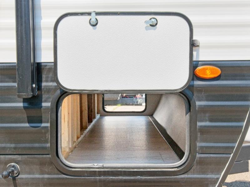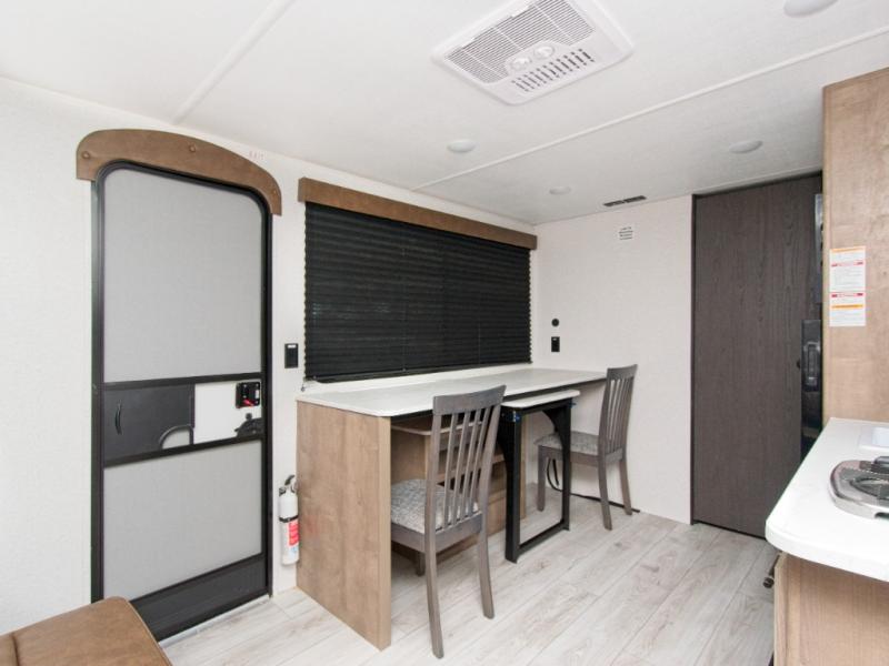 The Springdale Classic Mini travel trailers by Keystone are built for easy, lightweight towing with their single-axle design. The XL entry assist handle ensures easy access, while the power awning provides shade and protection for outdoor relaxation. Inside, you'll find blackout night shades, solid wood cabinet doors and drawers, and a shower skylight for extra headroom. Stay comfortable year-round with the 5,000 BTU sidewall A/C and 20K BTU furnace, and enjoy endless hot showers with the Girard tankless water heater.