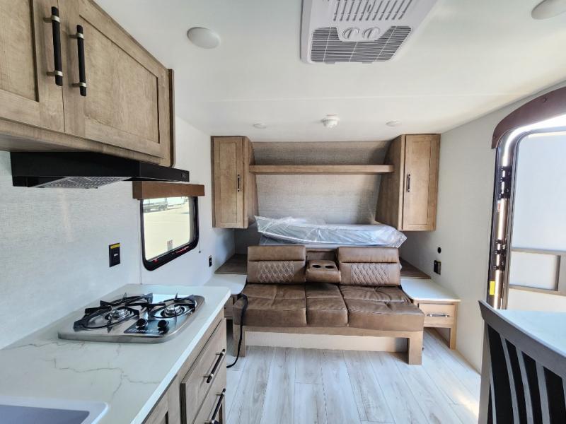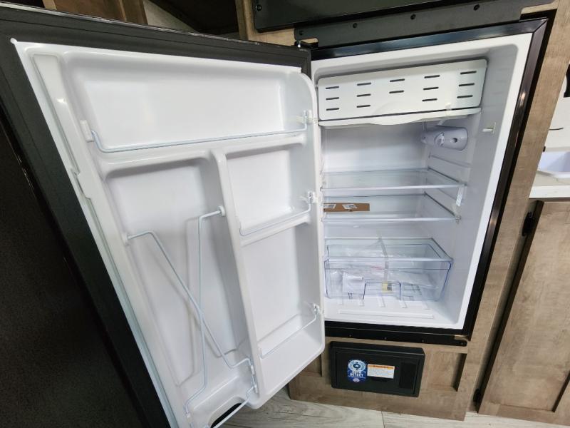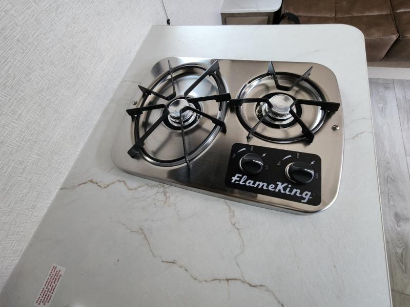 - Kitchen: Center kitchen with a 2-burner stove, overhead fan, and a 3.3 cu. ft. 12V refrigerator. Perfect for preparing delicious meals on the go.