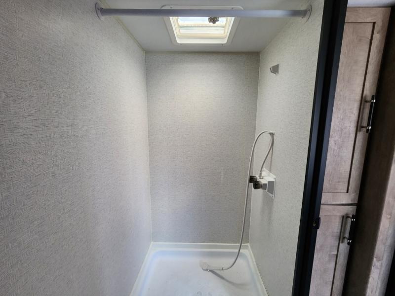- Bathroom: Rear bathroom with a plastic toilet, shower with curtain, and a bathroom vent/fan system.