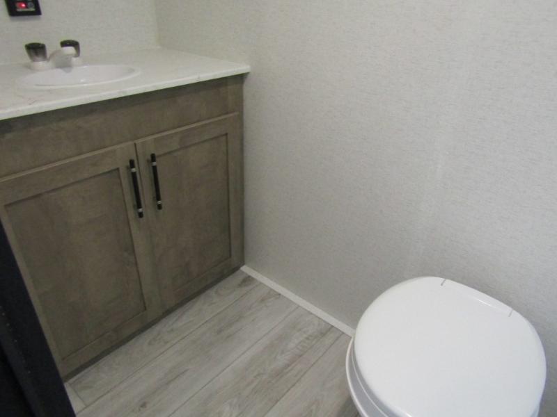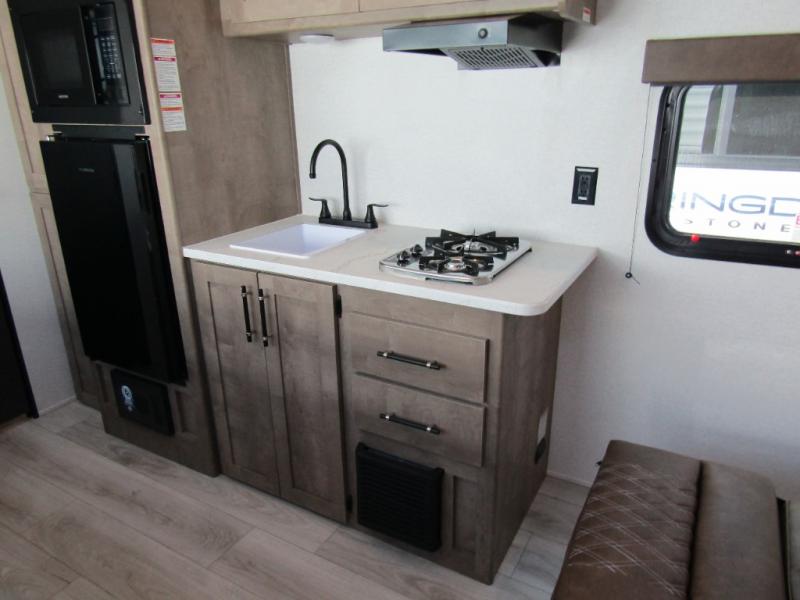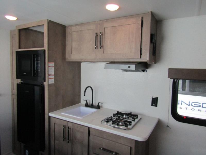 Inside, the 1710MB features a well-planned layout with a cozy living area, a fully equipped kitchen with a 12V 3 cubic foot refrigerator, and a rear bathroom with a shower, toilet, and vanity. The roof-mounted A/C keeps the interior cool, while stabilizer jacks provide secure setup at every campsite. A spare tire kit and RVIA seal ensure this Springdale Mini 1710MB is ready for adventure and built for reliability wherever the road takes you.