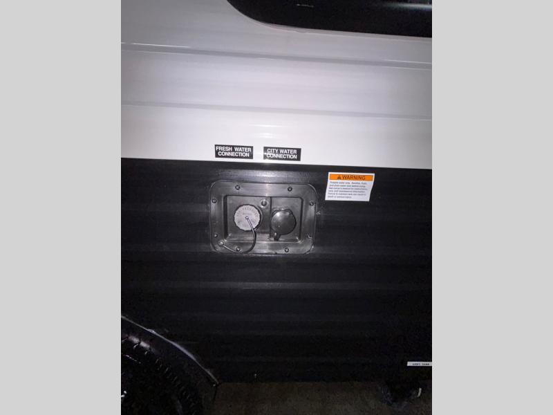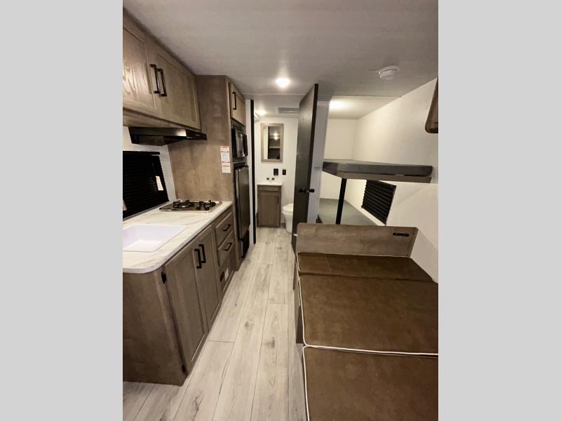 Get ready for outdoor fun with your favorite people when you have this trailer in tow! Once at your campsite, you can easily setup the 10' power awning, grab your camping chairs from the pass-thru storage, and relax or start playing. The cook will love the galley kitchen with the two burner cooktop, plus a refrigerator for cold items. If you like, you can eat inside at the booth dinette which doubles as sleeping space, and of course the kids will love the bunk beds next to the full bathroom. And you will sleep soundly on the front queen bed.