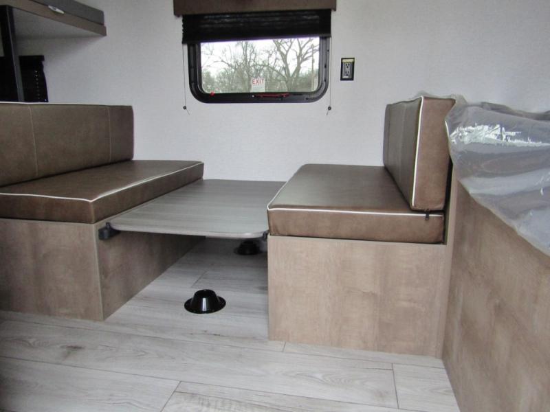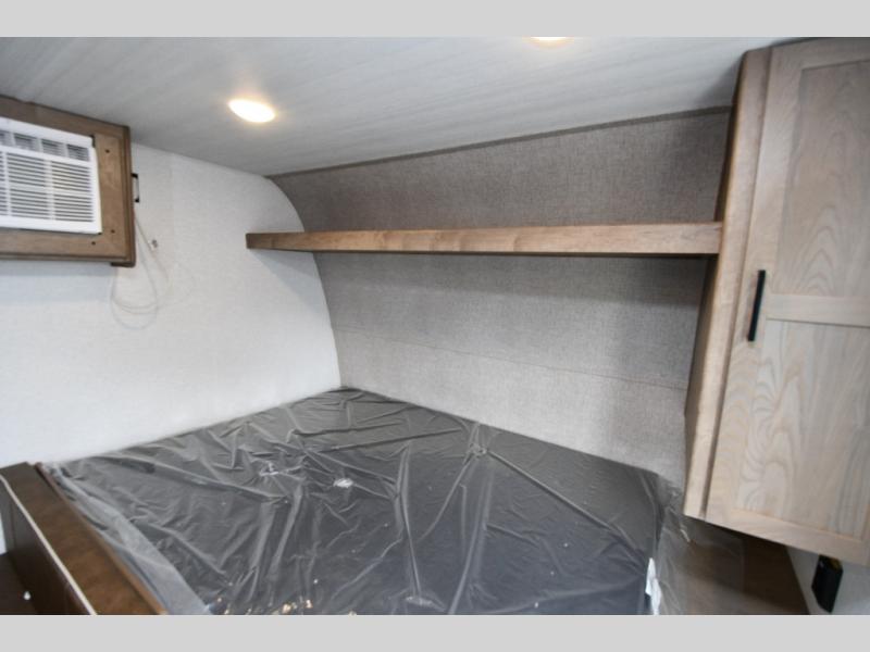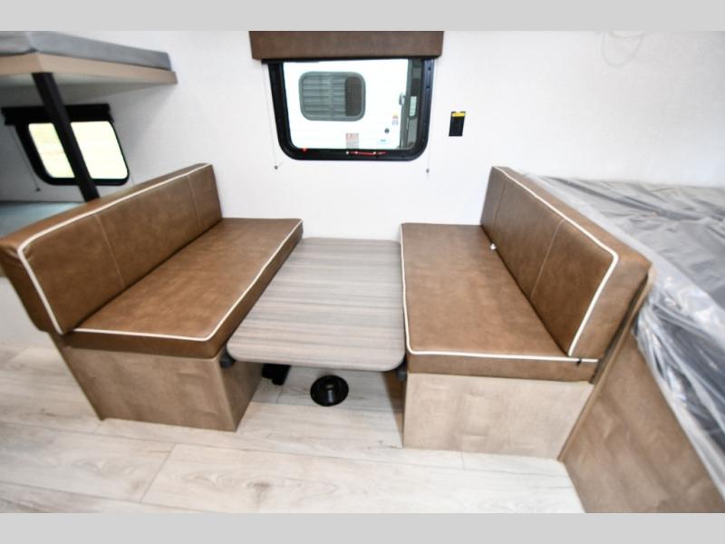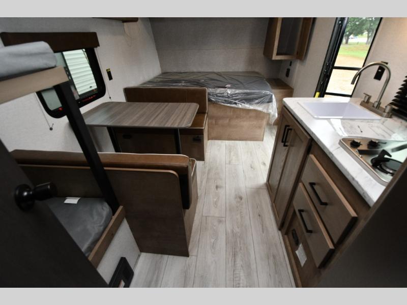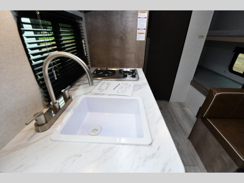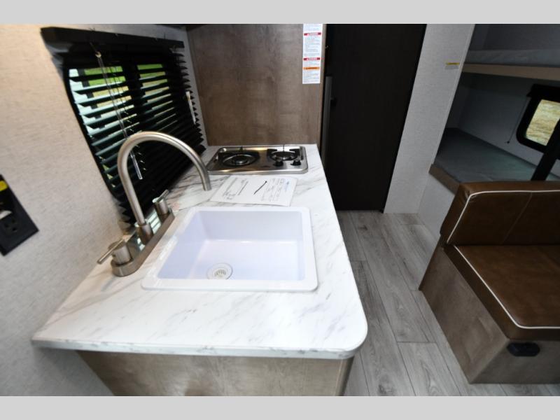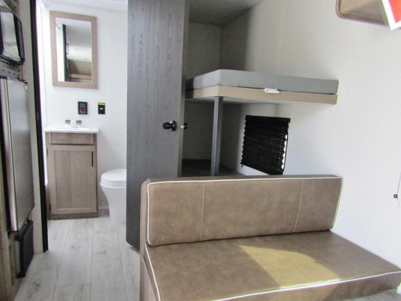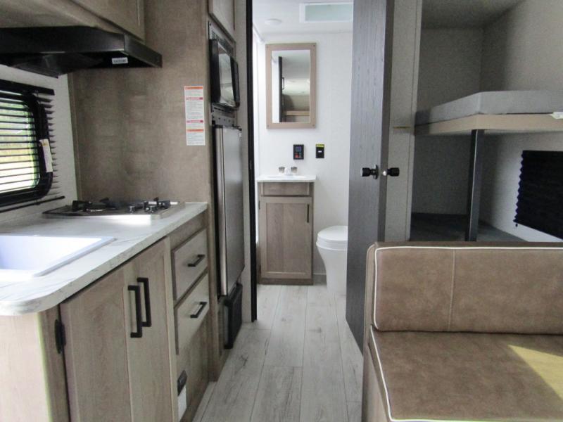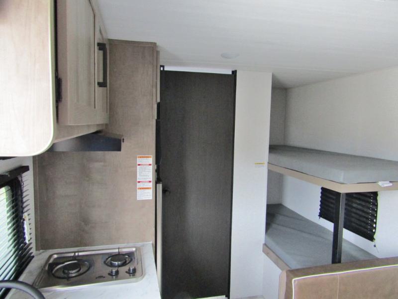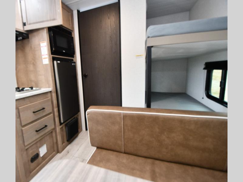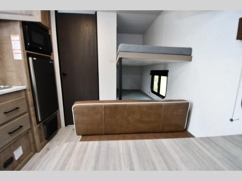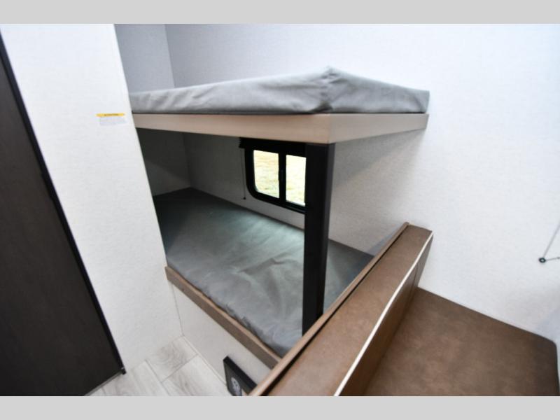 Inside, the rear bunkhouse gives kids their own fun retreat, while the front queen bed creates a cozy space for adults. The kitchen features a 3?cu.?ft. 12V refrigerator, two-burner cooktop, microwave, and ample storage for meals on the go. A convertible dinette adds extra sleeping space, and the private bathroom keeps everyone comfortable. Stabilizer jacks and a spare tire kit make setup simple, so you can focus on adventure from the moment you arrive.