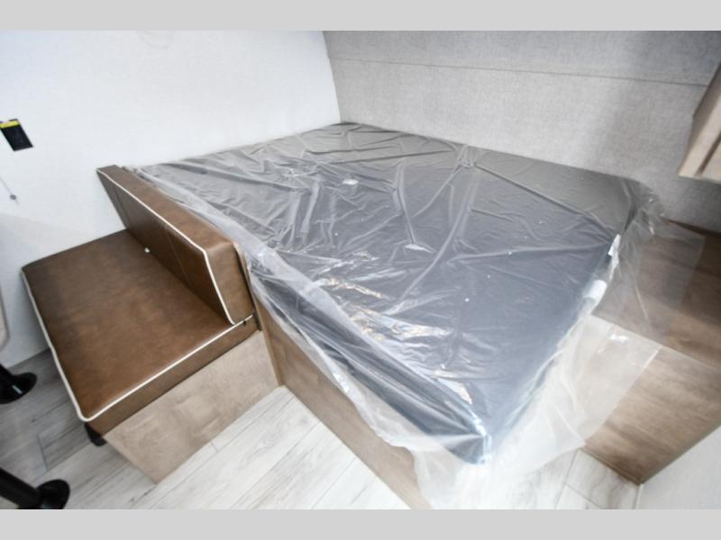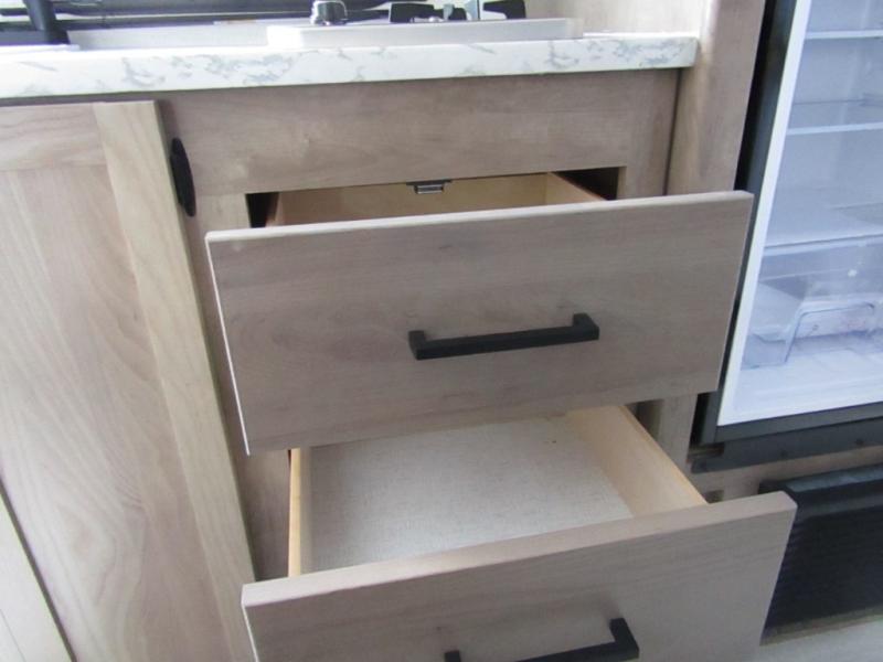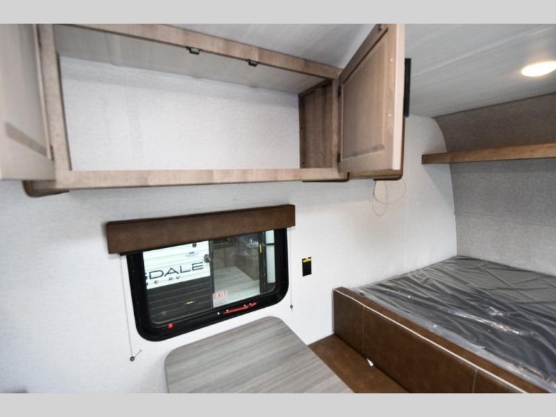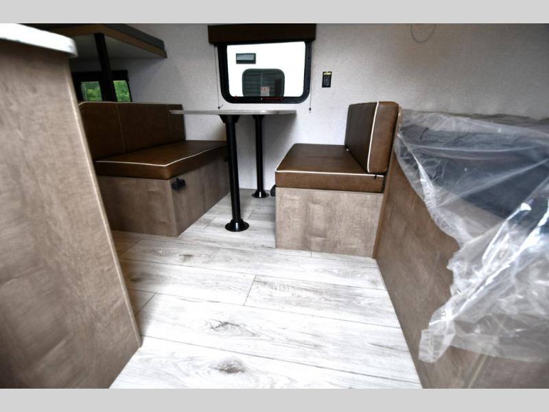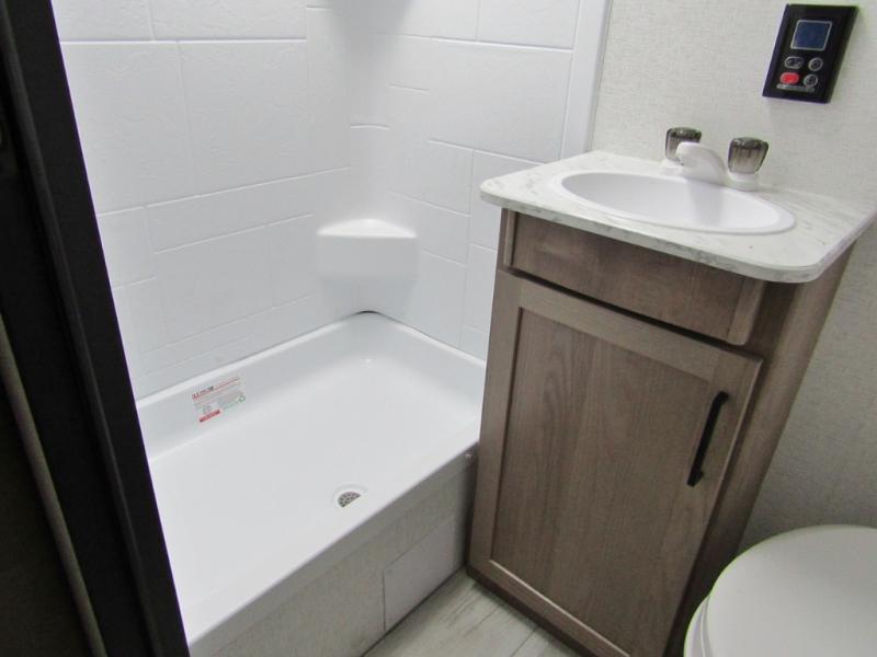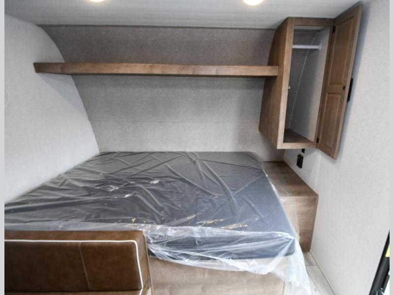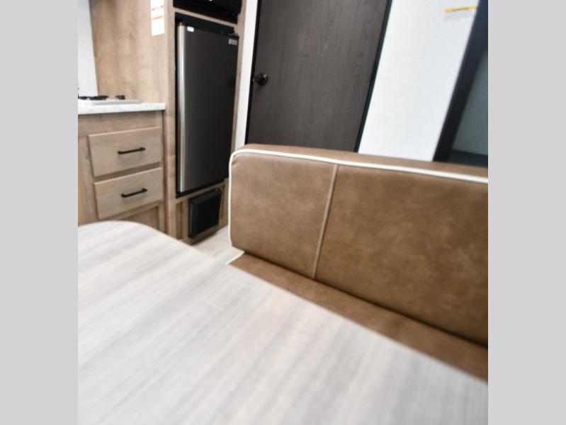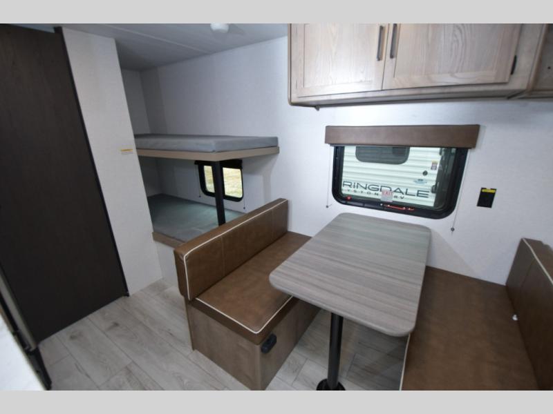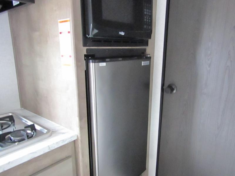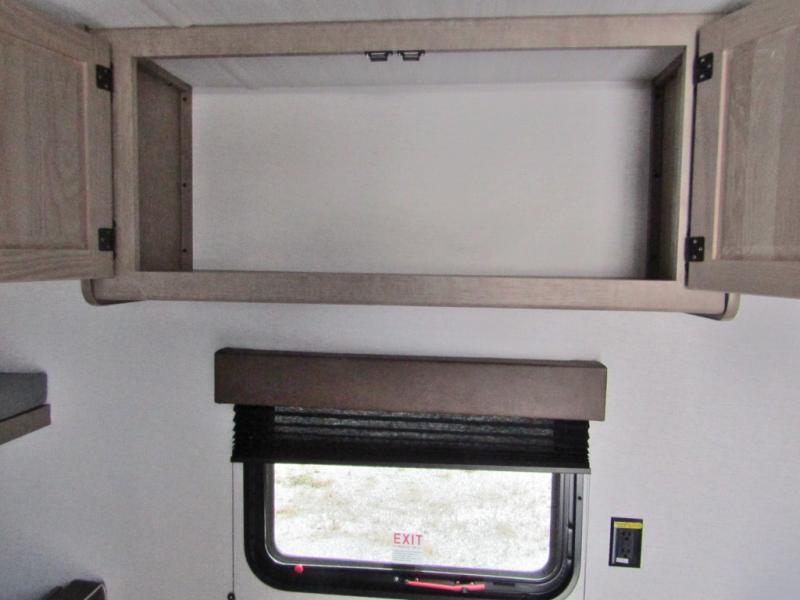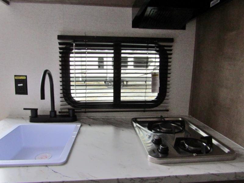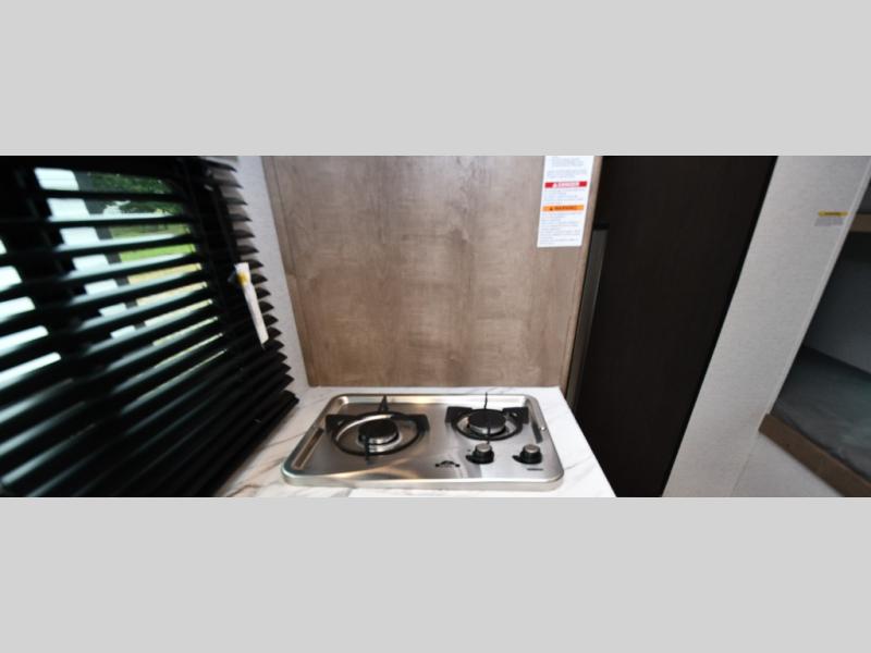 Inside, the rear bunkhouse gives kids their own fun retreat, while the front queen bed creates a cozy space for adults. The kitchen features a 3?cu.?ft. 12V refrigerator, two-burner cooktop, microwave, and ample storage for meals on the go. A convertible dinette adds extra sleeping space, and the private bathroom keeps everyone comfortable. Stabilizer jacks and a spare tire kit make setup simple, so you can focus on adventure from the moment you arrive.