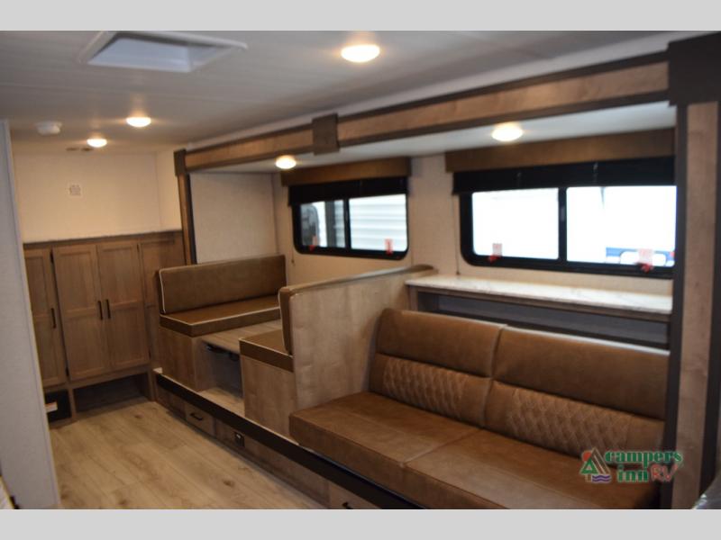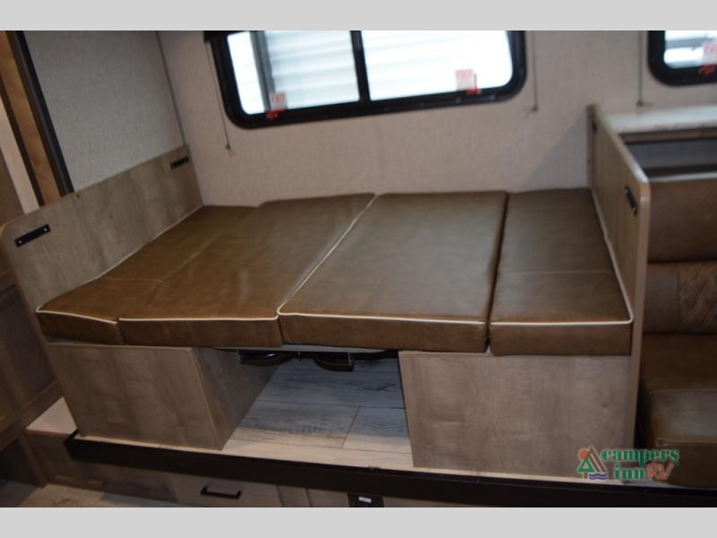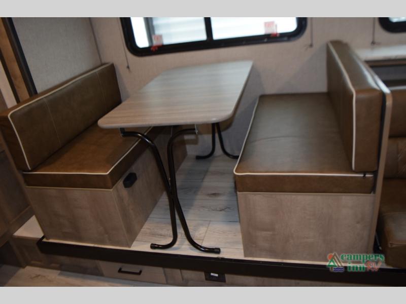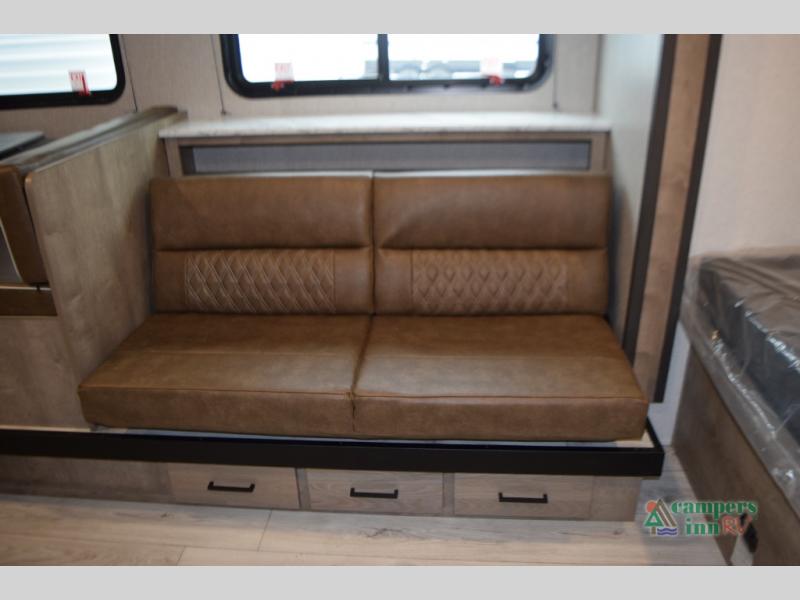 Sofa and booth dinette in the slide-out, both with under-seat storage drawers
