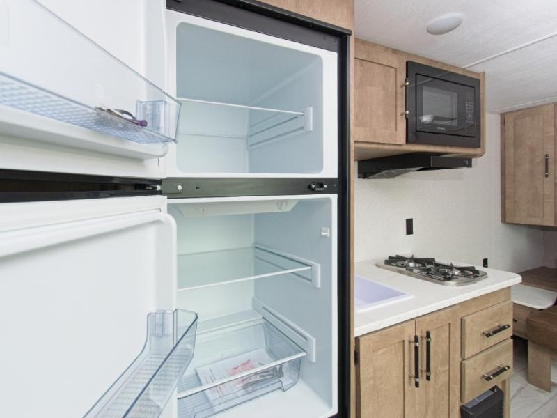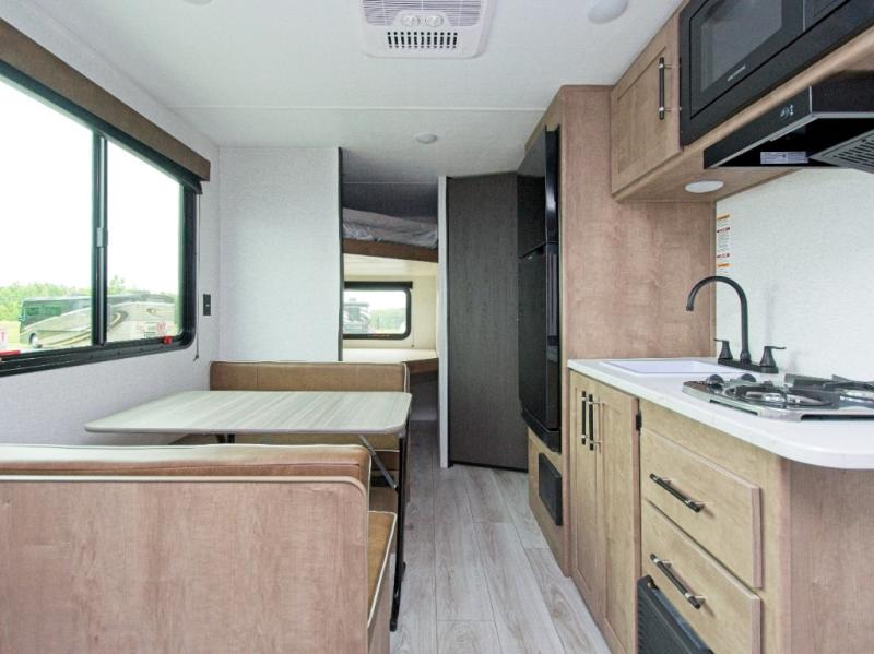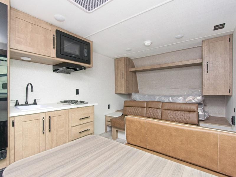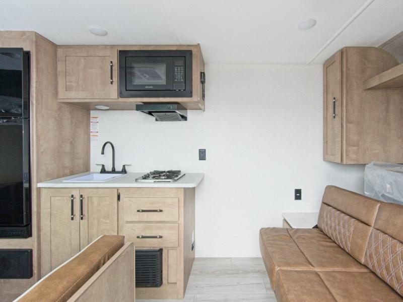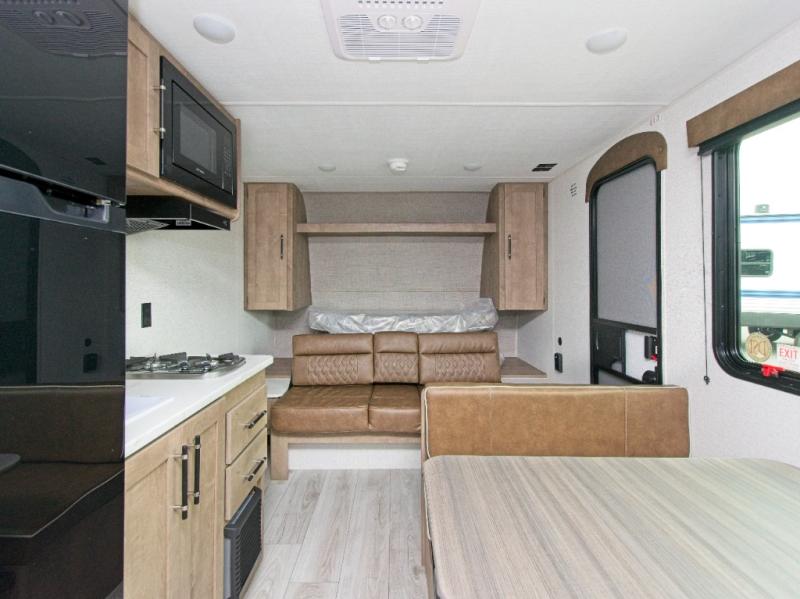 - Convenient Bathroom and Kitchen: The rear corner bath includes a tub, while the full kitchen ensures you can prepare meals on the go.