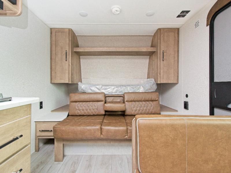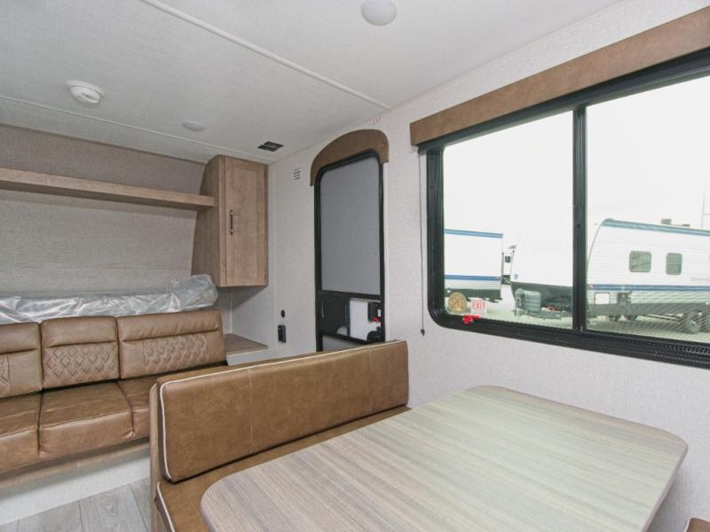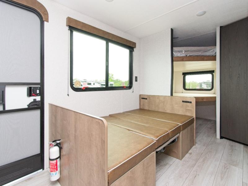 Comfortable Sleeping for the Whole Family: The double-size bunks provide ample space for kids or extra guests, while the queen Murphy bed at the front features a fold-down sofa that easily converts for nighttime use. The booth dinette provides a comfortable space for dining, playing games, or simply relaxing. This trailer ensures everyone gets a restful night’s sleep with flexible and spacious sleeping arrangements.