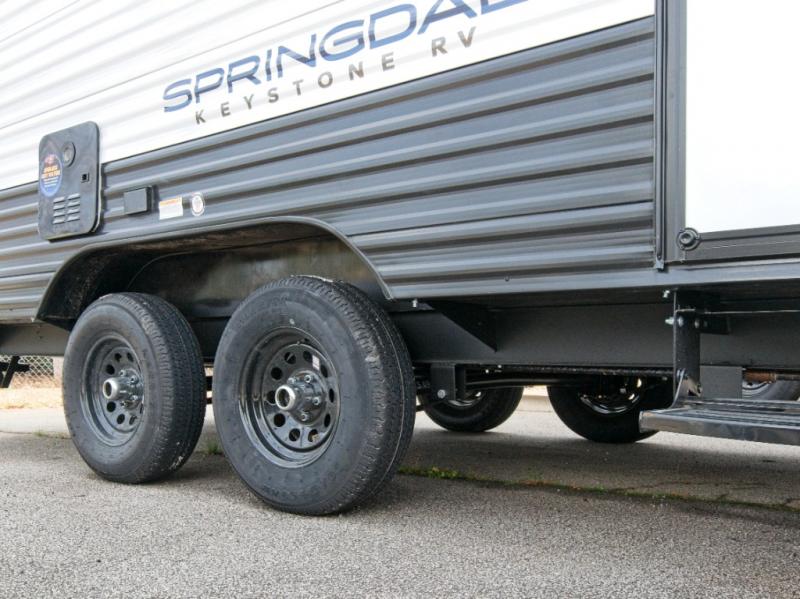Effortless Towing and Comfortable Living: Thanks to its dual axle design, the Springdale Classic Mini offers superior towing stability. The XL entry assist handle makes it easy to enter and exit, while the 5,000 BTU sidewall A/C and 20K BTU furnace ensure your comfort during all seasons. Plus, the Girard tankless water heater provides endless hot water for showers, so you can enjoy a long, relaxing shower after a day of adventure.