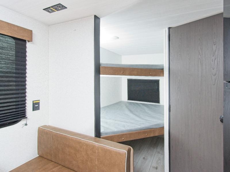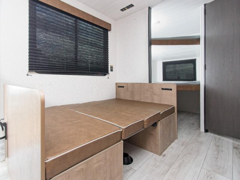 Comfortable Sleeping for the Whole Family: The double-size bunks provide ample space for kids or extra guests, while the queen Murphy bed at the front features a fold-down sofa that easily converts for nighttime use. The booth dinette provides a comfortable space for dining, playing games, or simply relaxing. This trailer ensures everyone gets a restful night’s sleep with flexible and spacious sleeping arrangements.