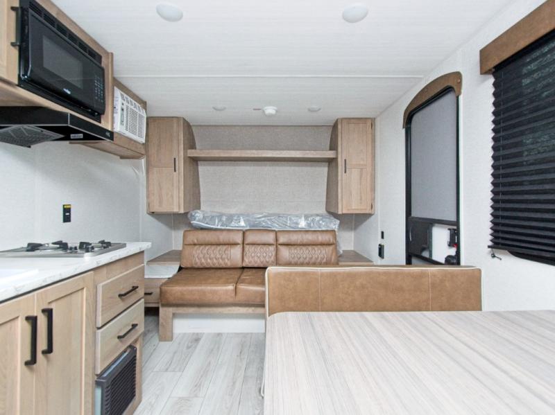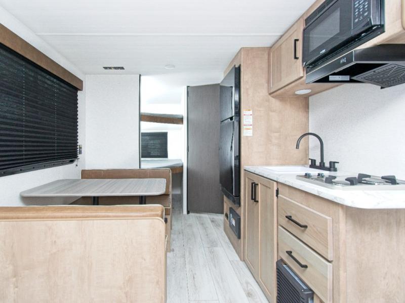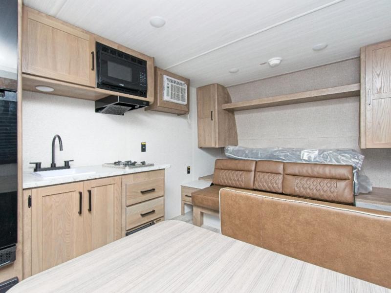 - Convenient Bathroom and Kitchen: The rear corner bath includes a tub, while the full kitchen ensures you can prepare meals on the go.