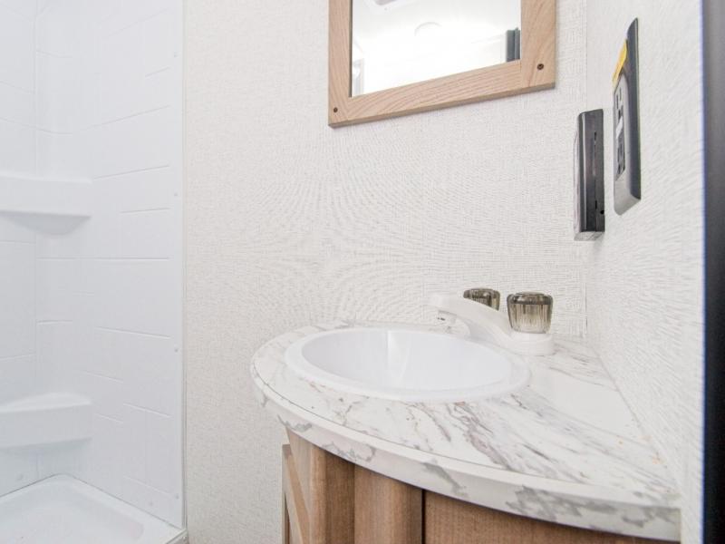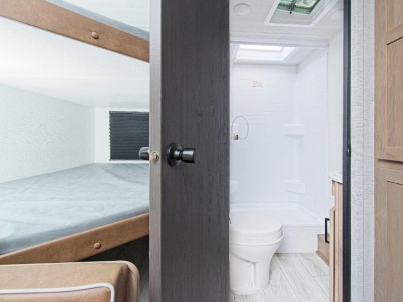Convenient Rear Corner Bath: The rear corner bath features a tub, toilet, and sink, giving you all the amenities you need to freshen up after a day of outdoor fun. It's the perfect place to relax and refresh, making it feel like home no matter where your travels take you.