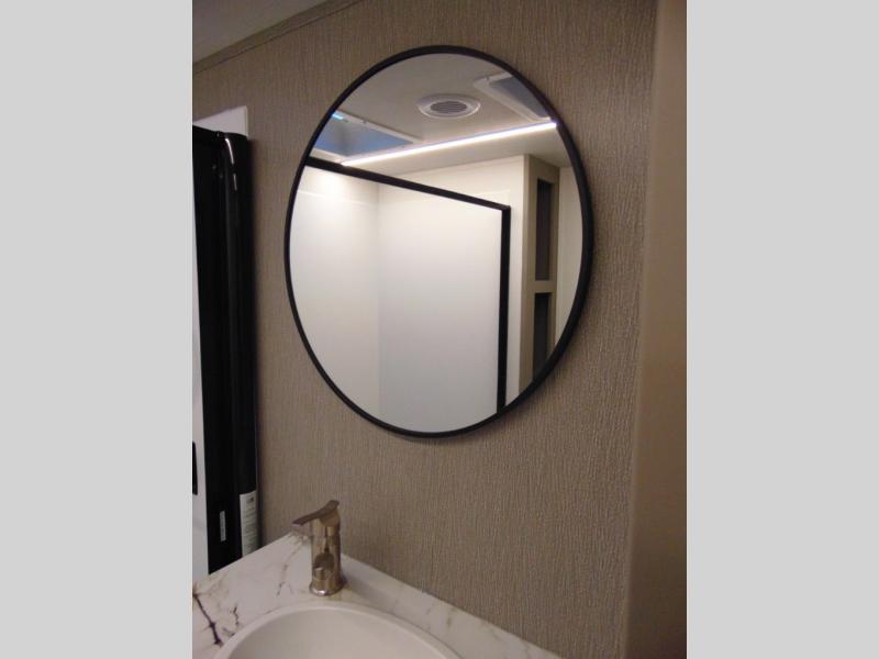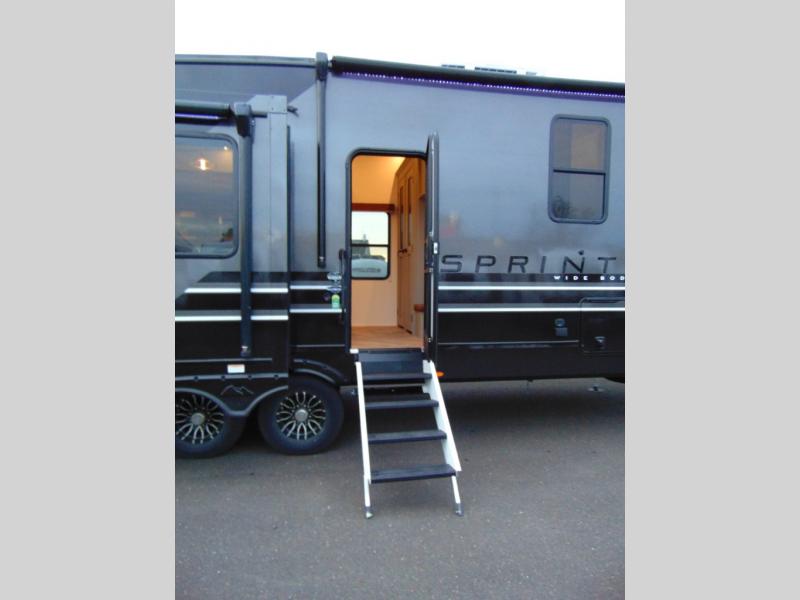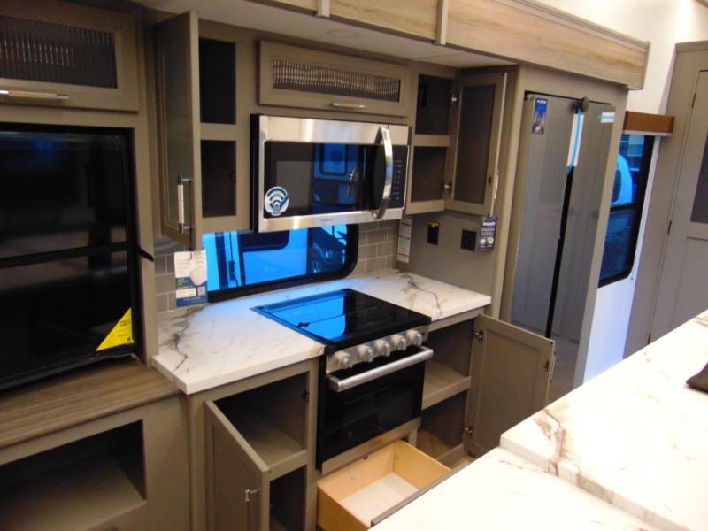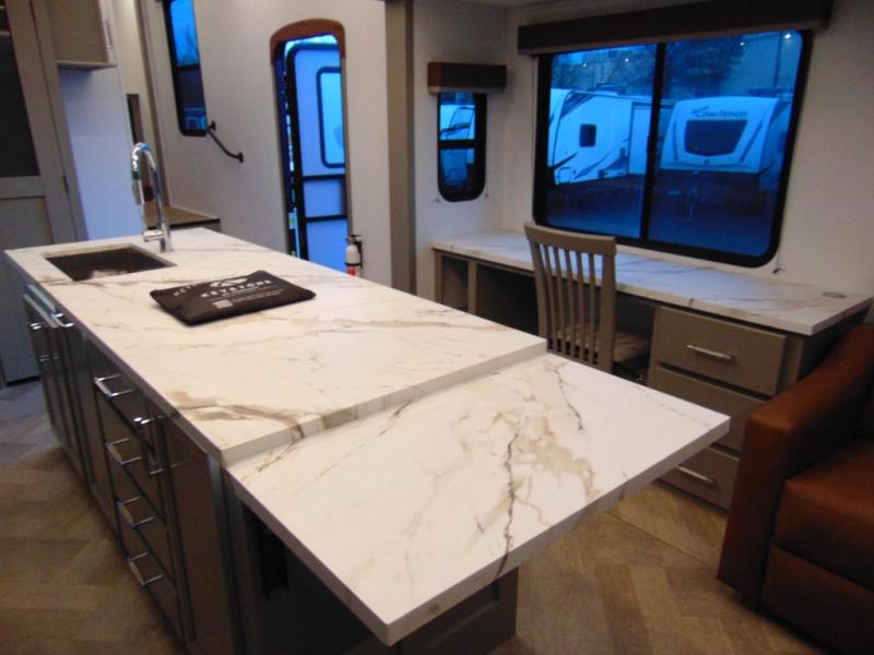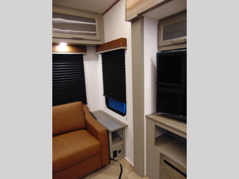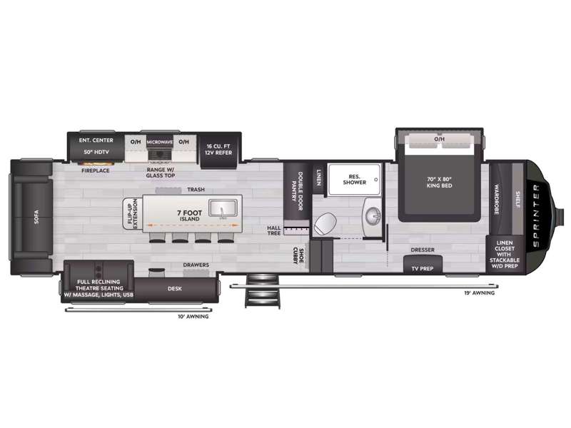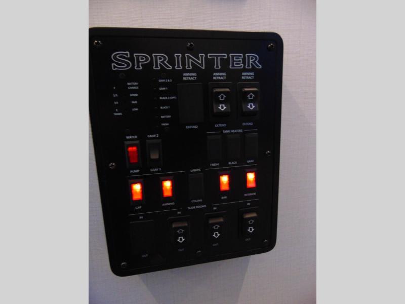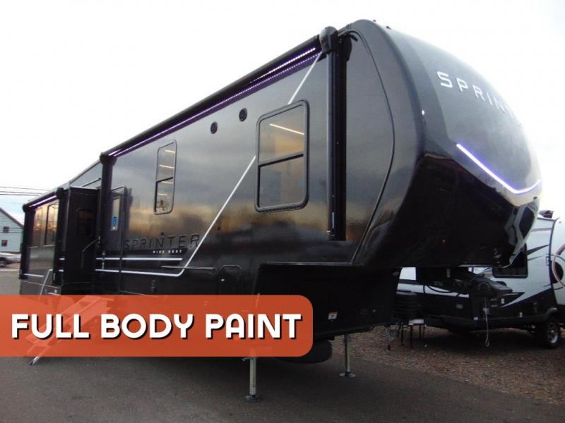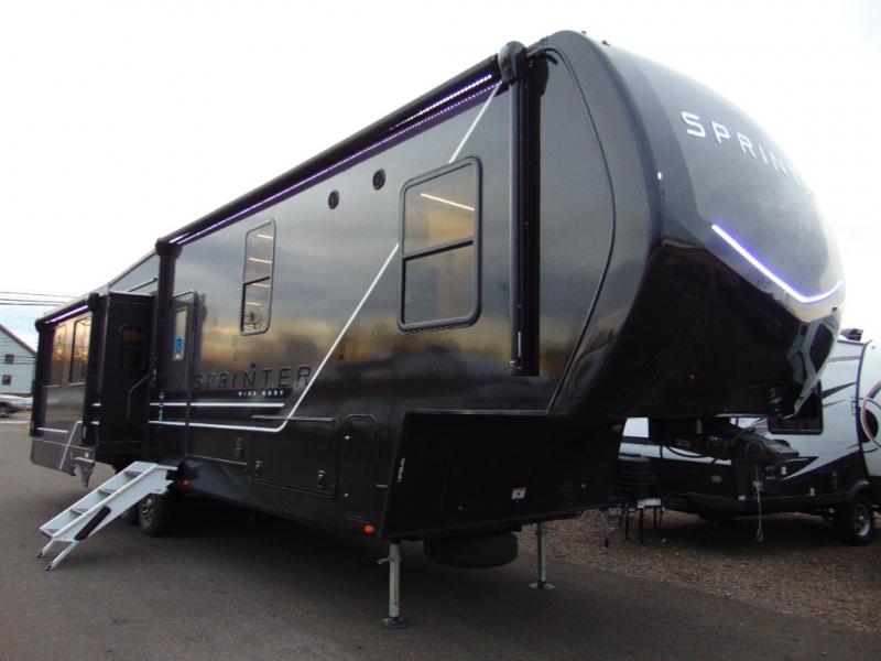 The Sprinter fifth wheels by Keystone feature spacious living areas, plenty of storage, and outstanding towability. Each unit is constructed with 2" aluminum framed and laminated sidewalls, a fully walkable roof, and dual layer insulation to help extend your camping season. The heated pass-through storage includes lockable slam latch baggage doors so you can easily pack your gear, and the one-touch 4-point leveling system features return hookup memory to have you set up in no-time. Head inside to find Congoleum vinyl flooring, Thomas Payne luxury collection furniture, residential style seamless marbled countertops, and an upgraded bedspread to name a few comforts. The Sprinter also includes a Girard tankless on-demand water heater, a central command center, plus a 30k BTU furnace and two A/C units to ensure your comfort!