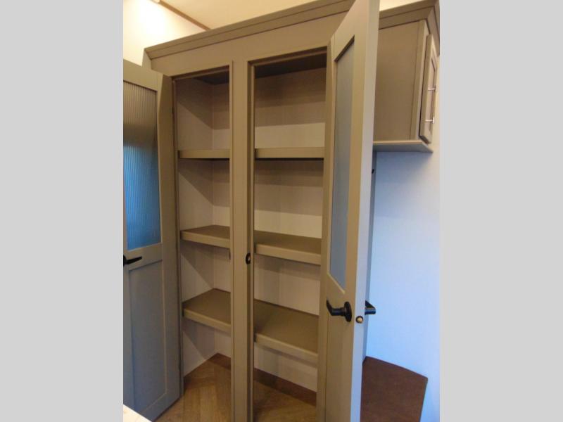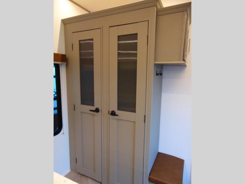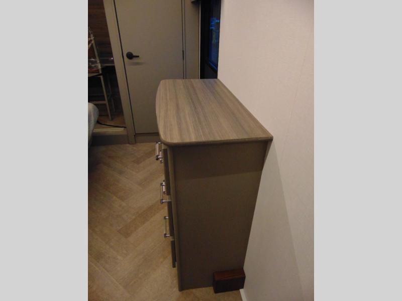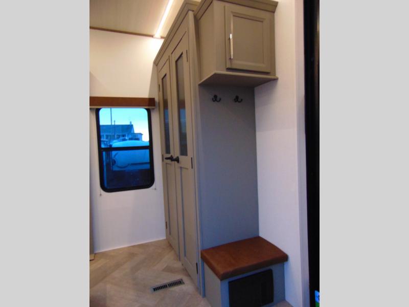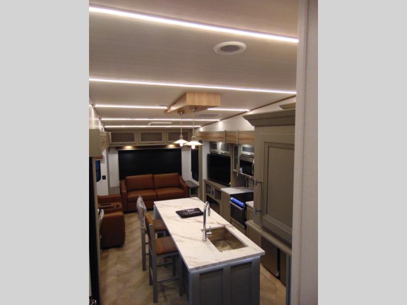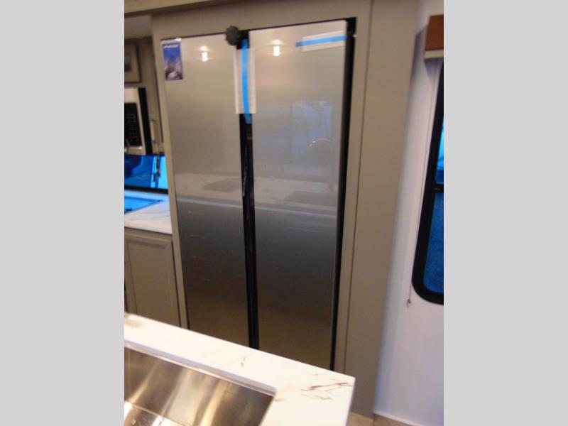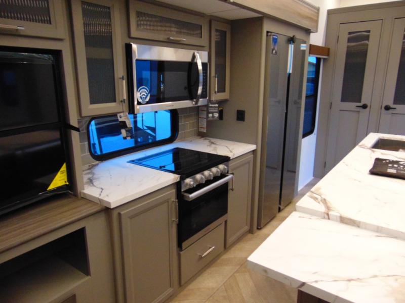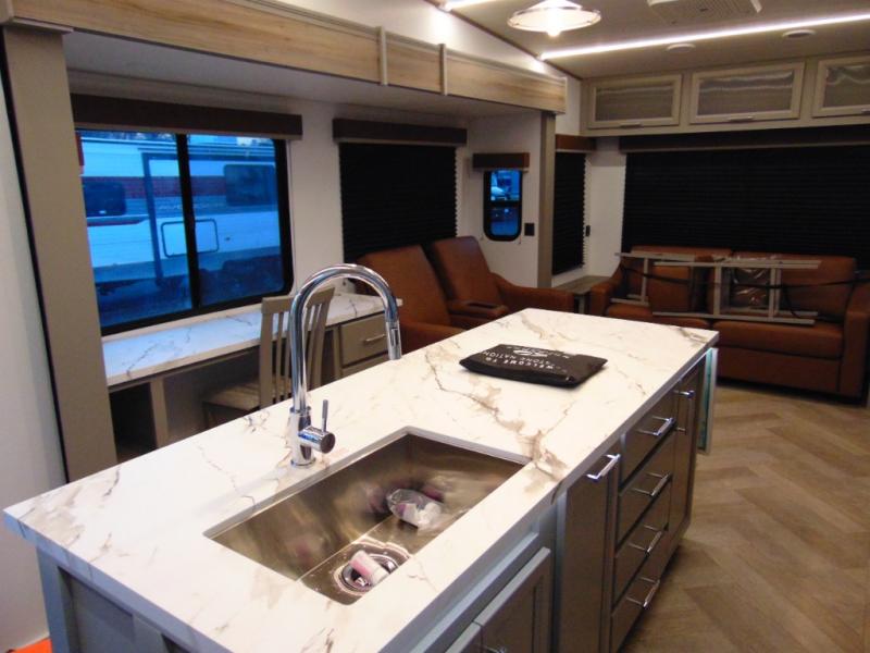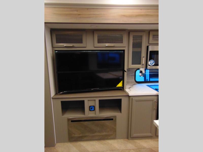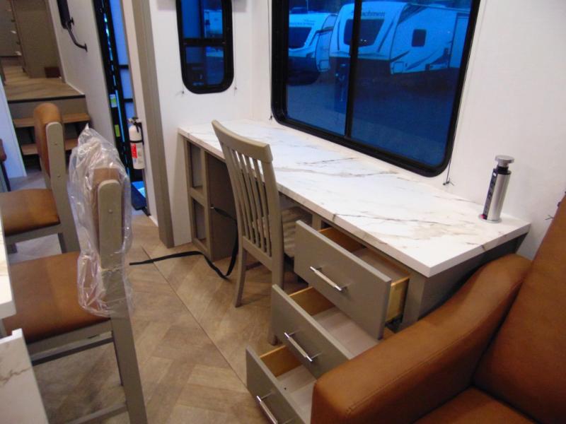 It will be so easy to enjoy camping trips or extended stays in this spacious fifth wheel! There are dual opposing slides in the combined kitchen and living area, giving you plenty of space to relax on the full reclining theater seating across from the fireplace/heater and 50" TV. There is also a beverage center here and a 7' kitchen bar along with a desk. The chef of your group will love the 7' kitchen island and floor-to-ceiling lighted pantry for dry goods, snacks and more. Your guests will love the Tri-Fold Sleeper Sofa with storage, plus a slide out for more space, while you take the front private bedroom with a king bed slide out. You can keep your things organized in the dresser, wardrobe, and closet with washer and dryer prep. Head outside to find the power awning, storage space, plus an exterior kitchen with a griddle, refrigerator, and storage/USB!
