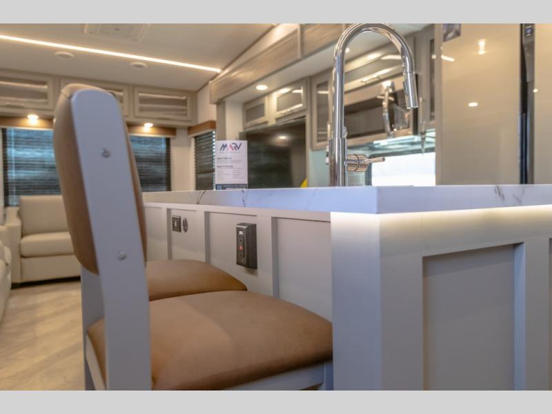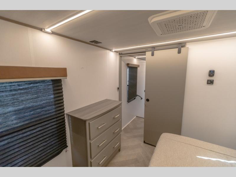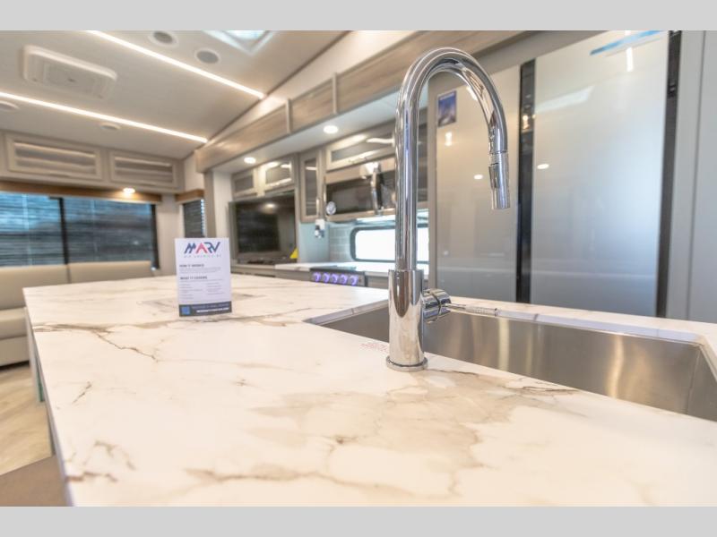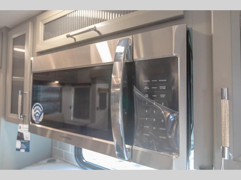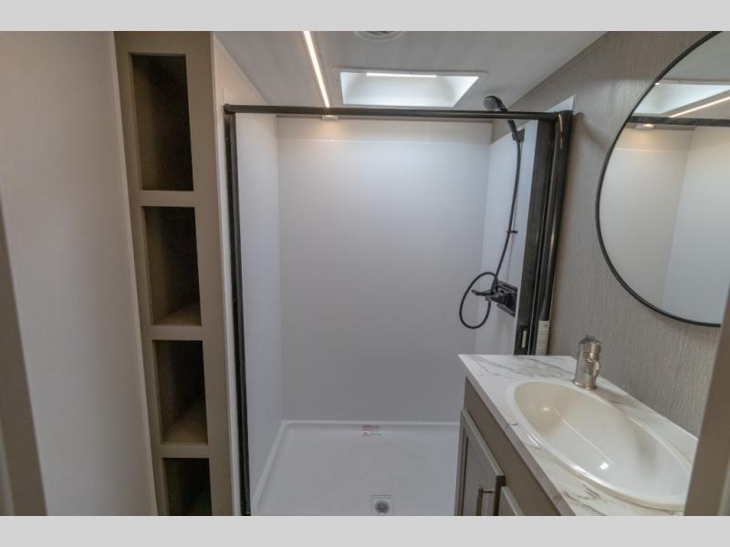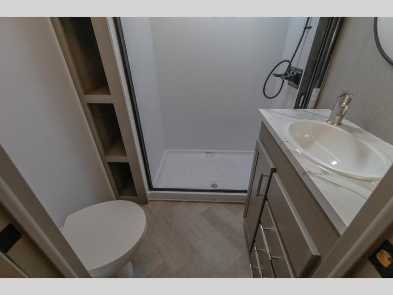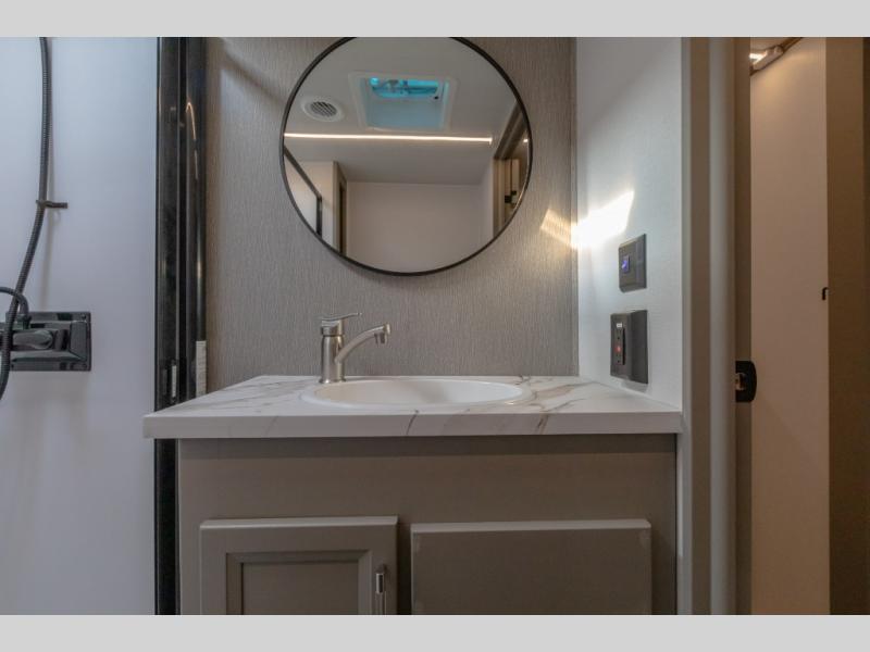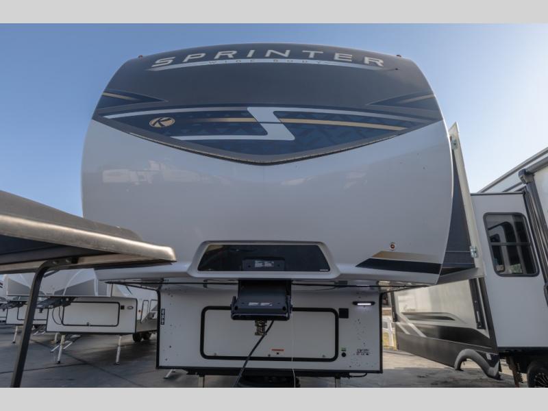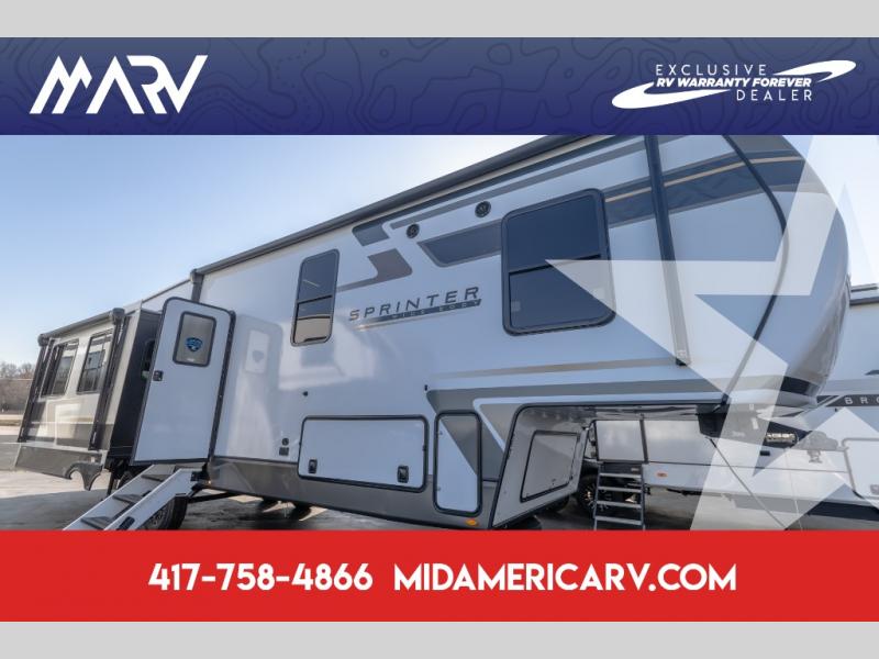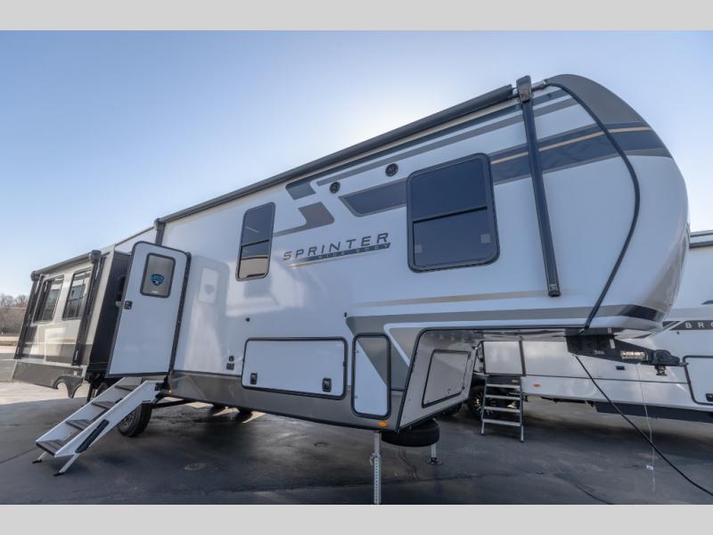 The Sprinter fifth wheels by Keystone feature spacious living areas, plenty of storage, and outstanding towability. Each unit is constructed with 2" aluminum framed and laminated sidewalls, a fully walkable roof, and dual layer insulation to help extend your camping season. The heated pass-through storage includes lockable slam latch baggage doors so you can easily pack your gear, and the one-touch 4-point leveling system features return hookup memory to have you set up in no-time. Head inside to find Congoleum vinyl flooring, Thomas Payne luxury collection furniture, residential style seamless marbled countertops, and an upgraded bedspread to name a few comforts. The Sprinter also includes a Girard tankless on-demand water heater, a central command center, plus a 30k BTU furnace and two A/C units to ensure your comfort!