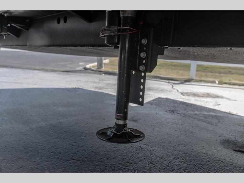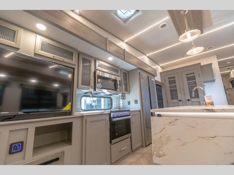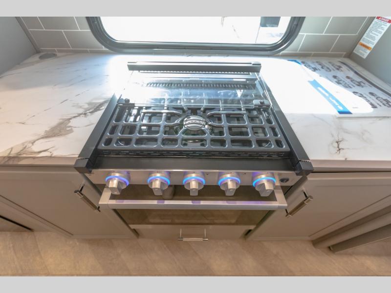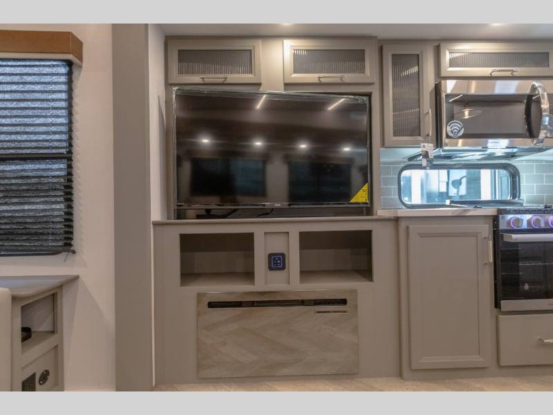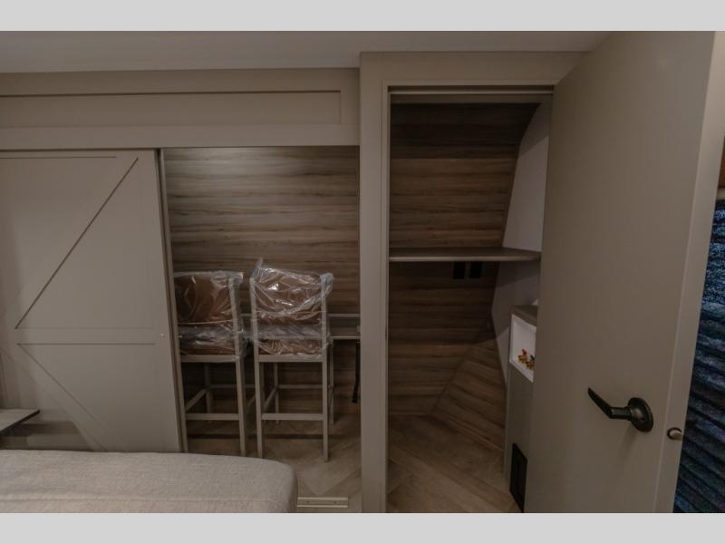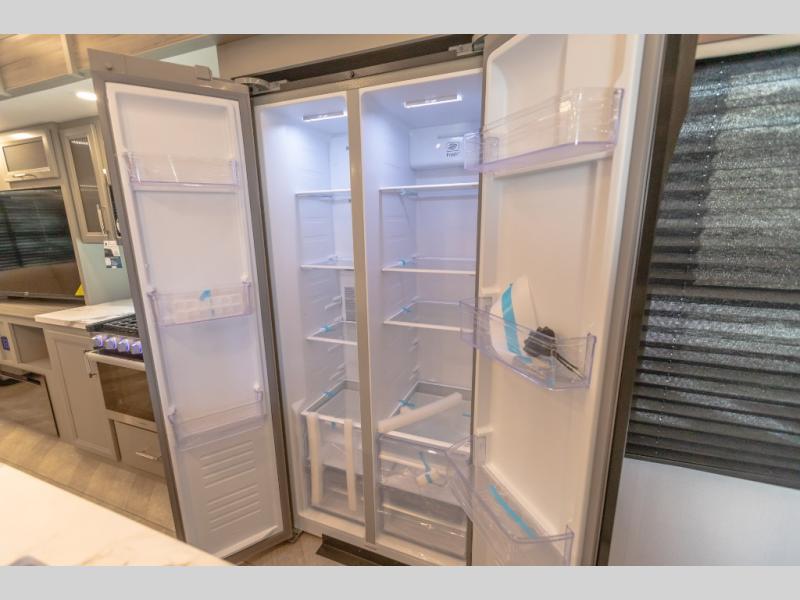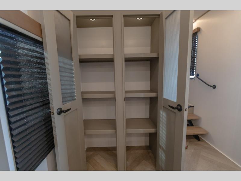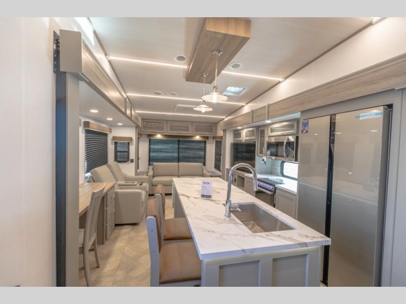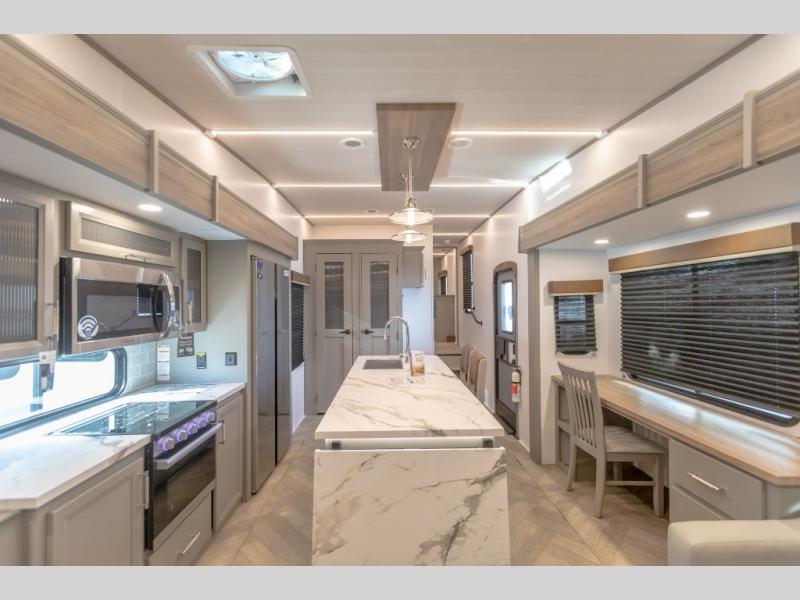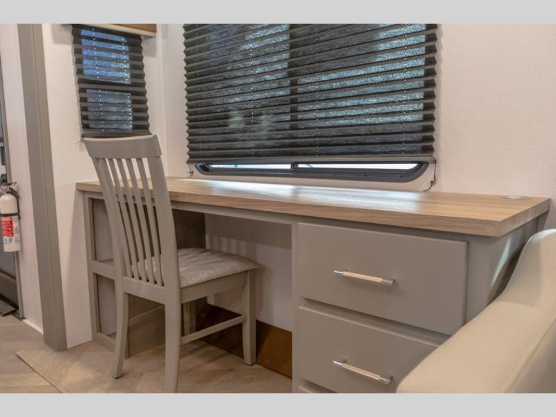 It will be so easy to enjoy camping trips or extended stays in this spacious fifth wheel! There are dual opposing slides in the combined kitchen and living area, giving you plenty of space to relax on the full reclining theater seating across from the fireplace and 50" TV. There is also a desk with drawers and a chair where you can get some work done if needed. The chef of your group will love the 7' kitchen island and double door pantry for dry goods, snacks and more. Your guests can sleep on the rear sofa, while you take the front private bedroom with a king bed slide out. You can keep your things organized in the dresser, wardrobe, and linen closet with stackable washer and dryer prep.
