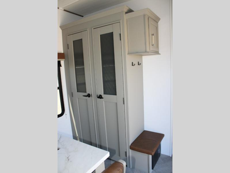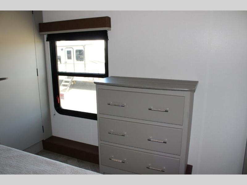 - Private Front Bedroom with King Bed Slide – Features a dresser, wardrobe, and linen closet with washer/dryer prep.