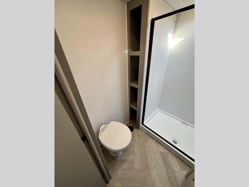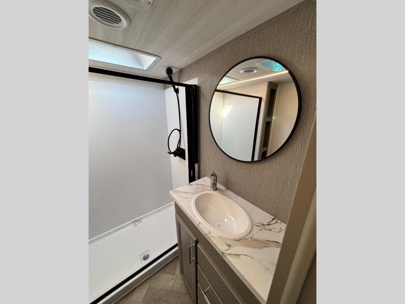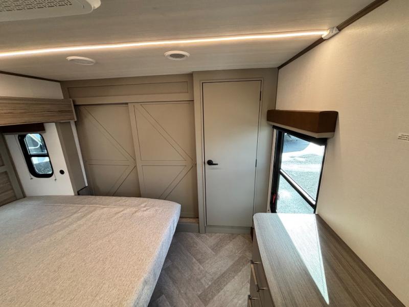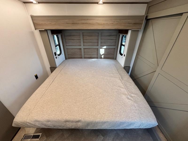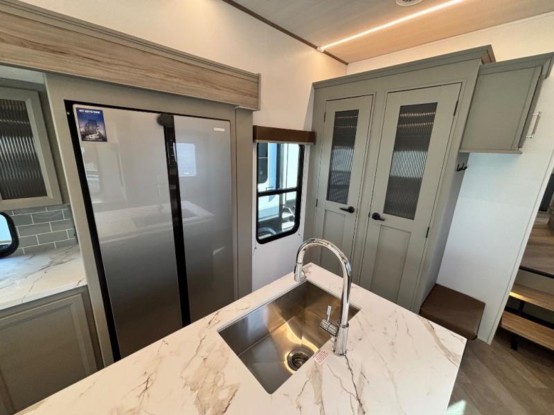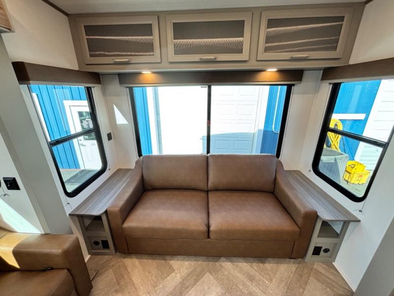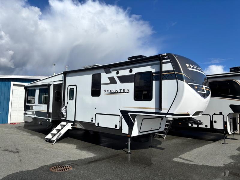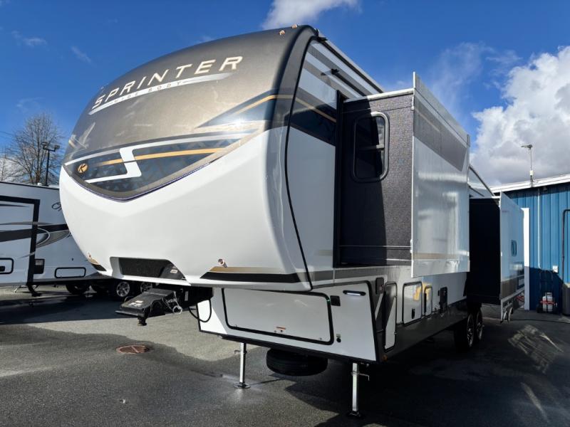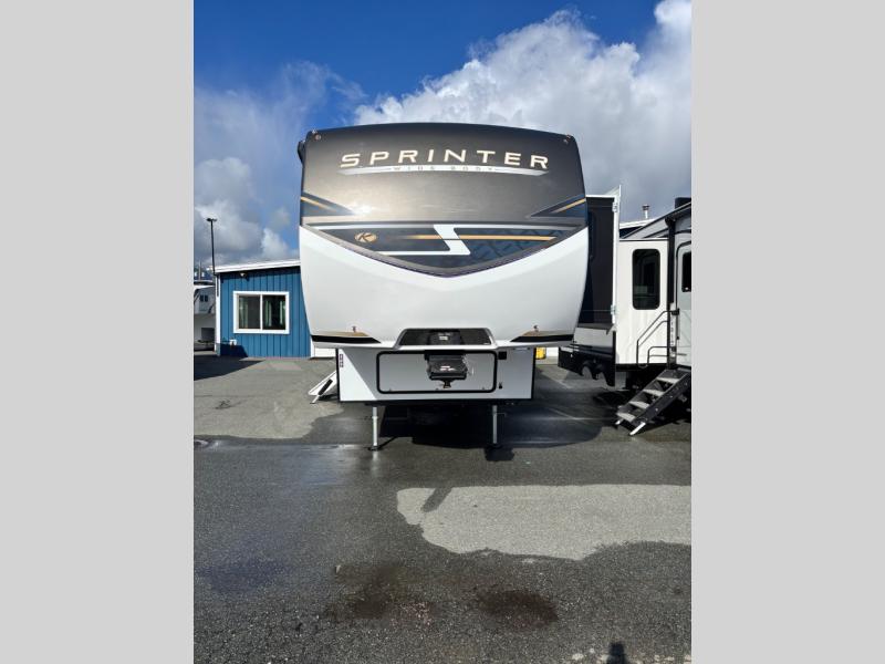 The Sprinter fifth wheels by Keystone feature spacious living areas, plenty of storage, and outstanding towability. Each unit is constructed with 2" aluminum framed and laminated sidewalls, a fully walkable roof, and dual layer insulation to help extend your camping season. The heated pass-through storage includes lockable slam latch baggage doors so you can easily pack your gear, and the one-touch 4-point leveling system features return hookup memory to have you set up in no-time. Head inside to find Congoleum vinyl flooring, Thomas Payne luxury collection furniture, residential style seamless marbled countertops, and an upgraded bedspread to name a few comforts. The Sprinter also includes a Girard tankless on-demand water heater, a central command center, plus a 30k BTU furnace and two A/C units to ensure your comfort!