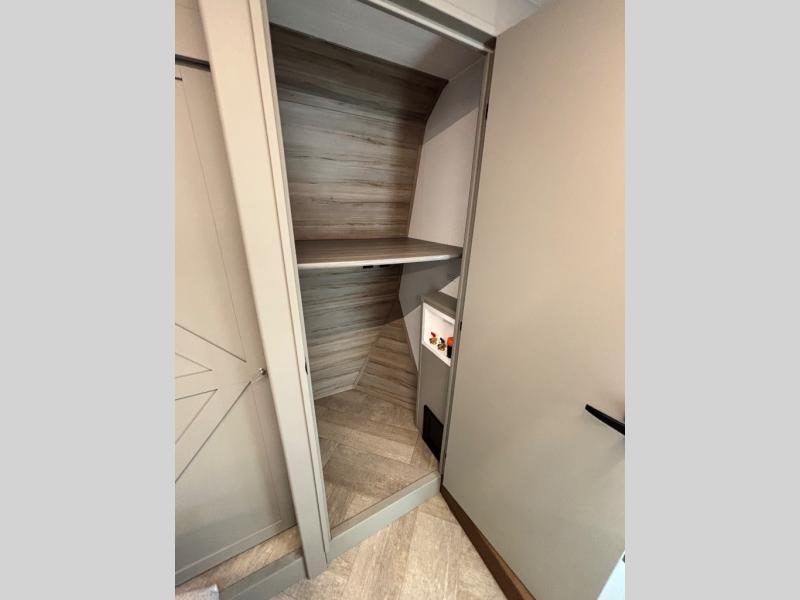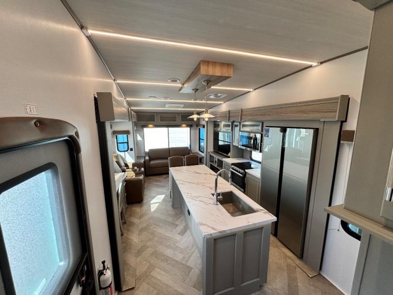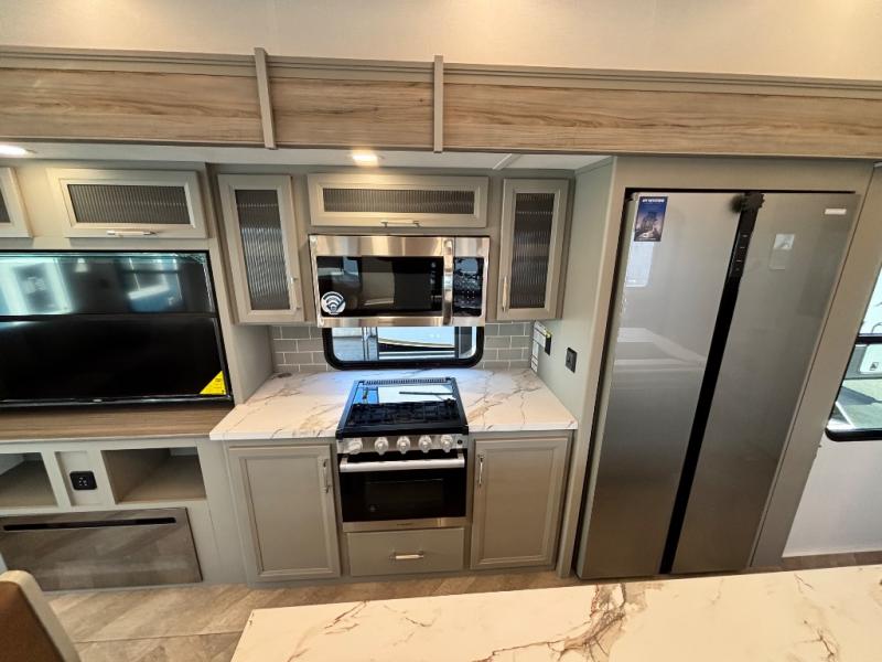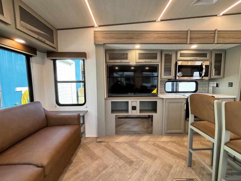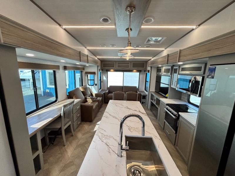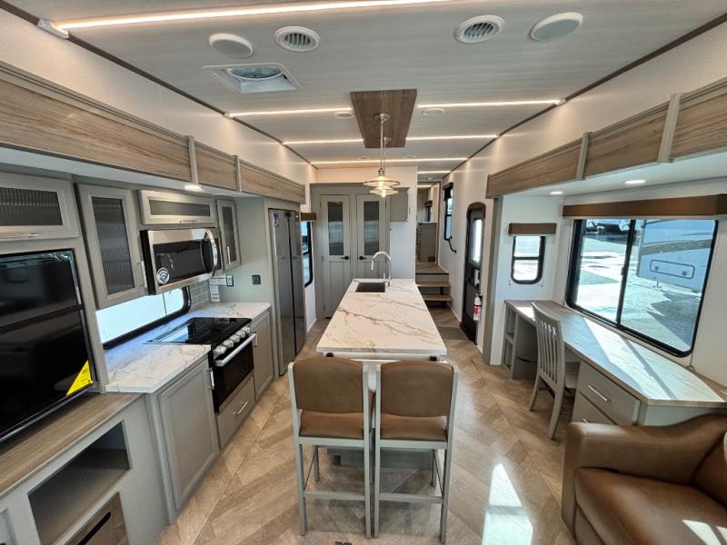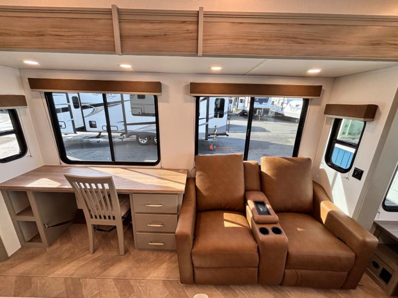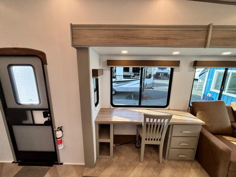 It will be so easy to enjoy camping trips or extended stays in this spacious fifth wheel! There are dual opposing slides in the combined kitchen and living area, giving you plenty of space to relax on the full reclining theater seating across from the fireplace and 50" TV. There is also a desk with drawers and a chair where you can get some work done if needed. The chef of your group will love the 7' kitchen island and double door pantry for dry goods, snacks and more. Your guests can sleep on the rear sofa, while you take the front private bedroom with a king bed slide out. You can keep your things organized in the dresser, wardrobe, and linen closet with stackable washer and dryer prep.