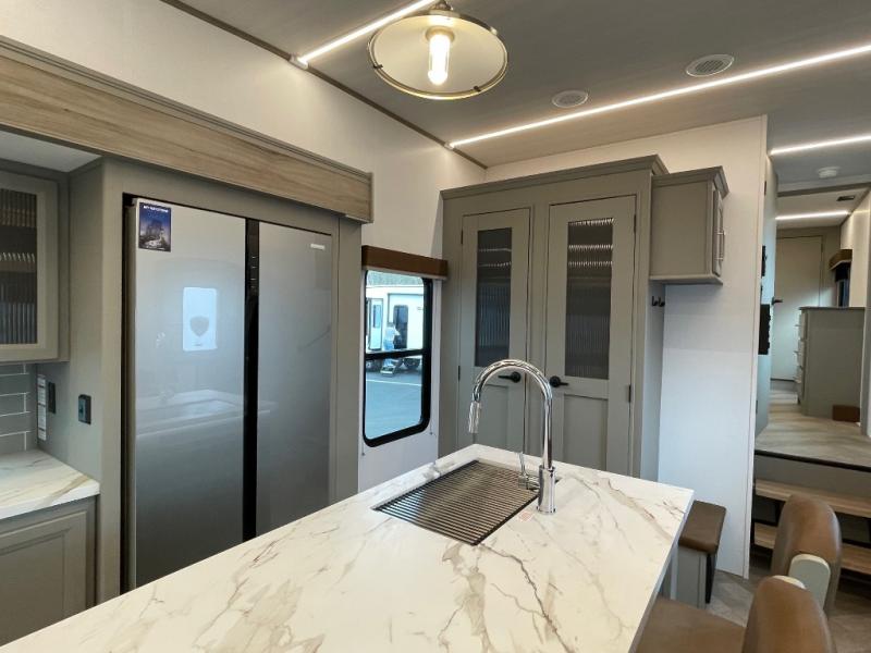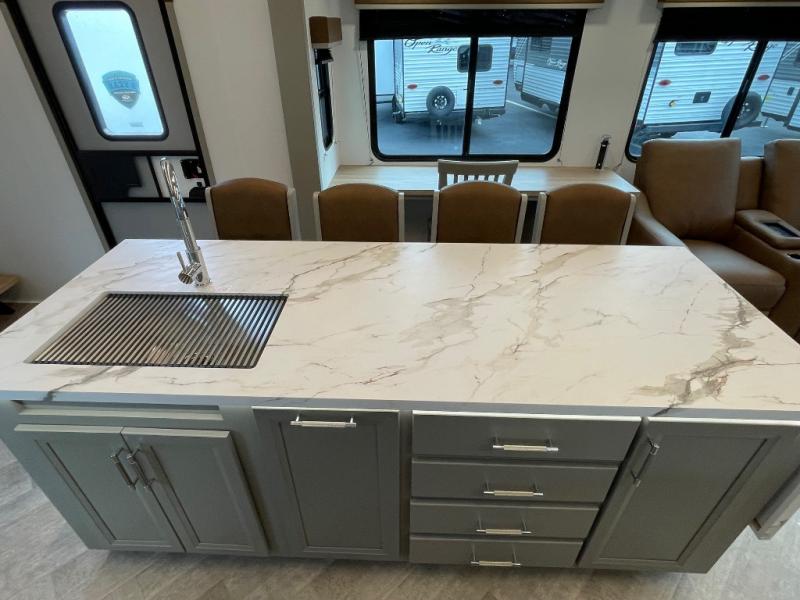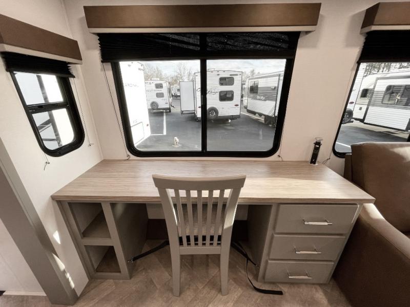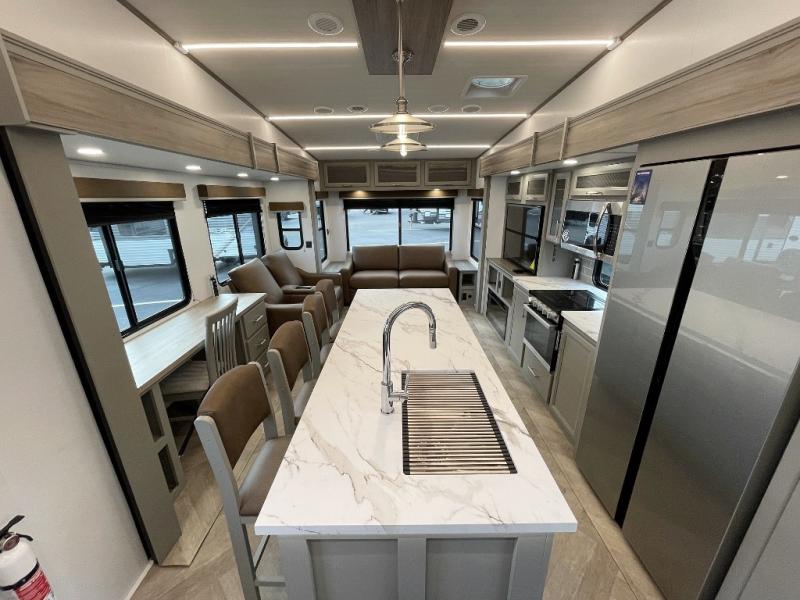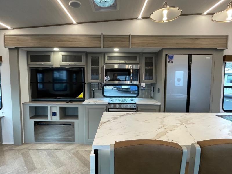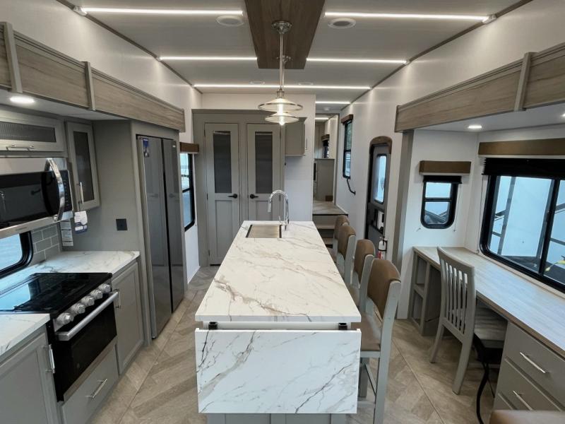 It will be so easy to enjoy camping trips or extended stays in this spacious fifth wheel! There are dual opposing slides in the combined kitchen and living area, giving you plenty of space to relax on the full reclining theater seating across from the fireplace and 50" TV. There is also a desk with drawers and a chair where you can get some work done if needed. The chef of your group will love the 7' kitchen island and double door pantry for dry goods, snacks and more. Your guests can sleep on the rear sofa, while you take the front private bedroom with a king bed slide out. You can keep your things organized in the dresser, wardrobe, and linen closet with stackable washer and dryer prep.