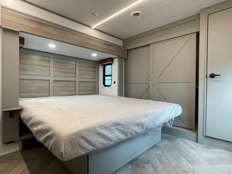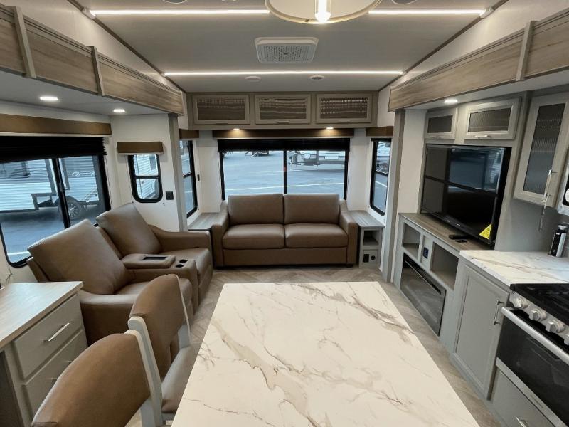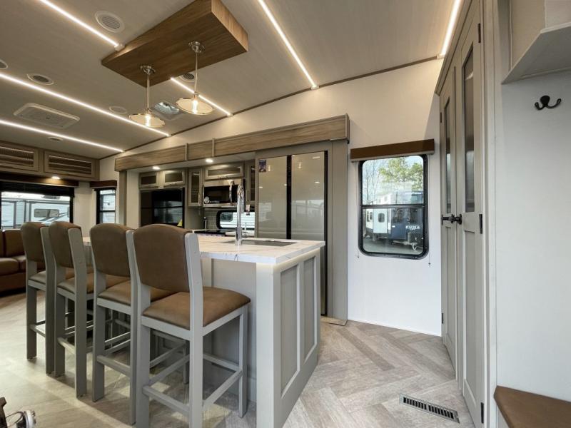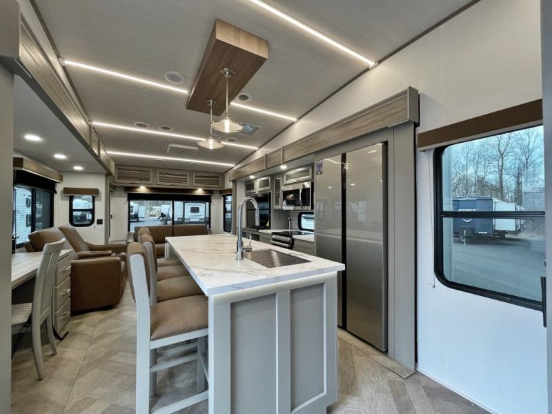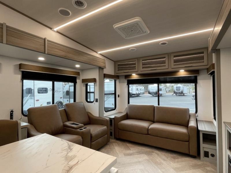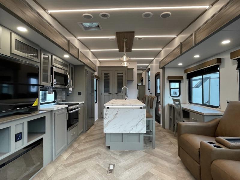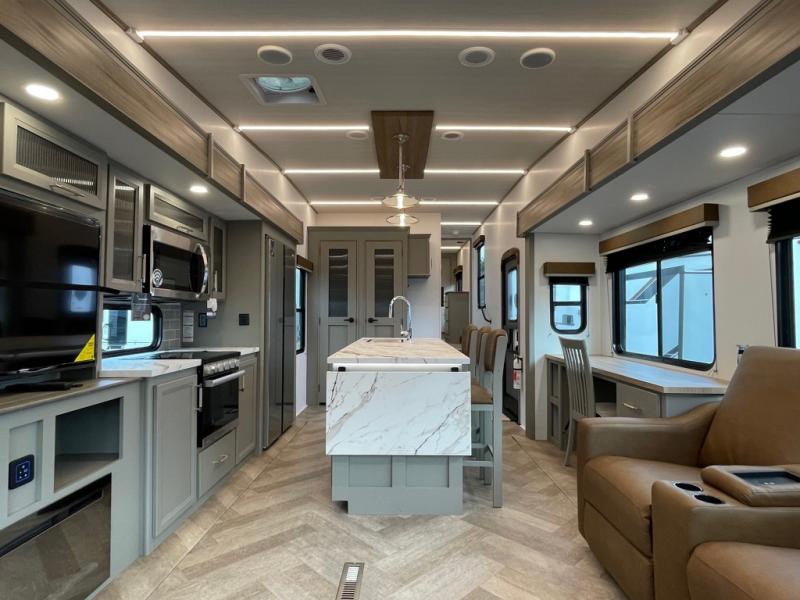 It will be so easy to enjoy camping trips or extended stays in this spacious fifth wheel! There are dual opposing slides in the combined kitchen and living area, giving you plenty of space to relax on the full reclining theater seating across from the fireplace and 50" TV. There is also a desk with drawers and a chair where you can get some work done if needed. The chef of your group will love the 7' kitchen island and double door pantry for dry goods, snacks and more. Your guests can sleep on the rear sofa, while you take the front private bedroom with a king bed slide out. You can keep your things organized in the dresser, wardrobe, and linen closet with stackable washer and dryer prep.