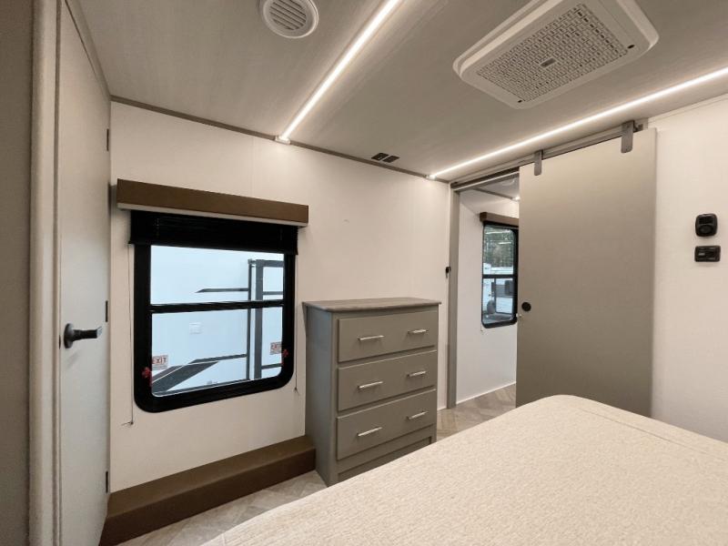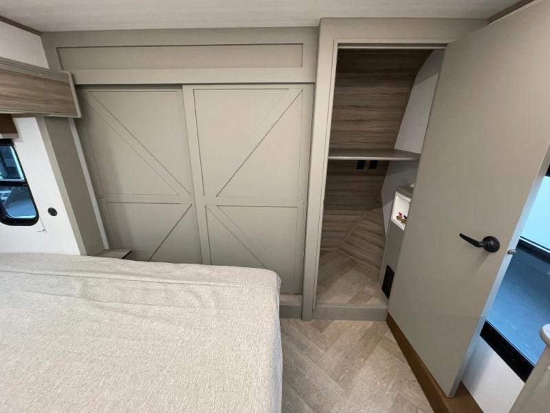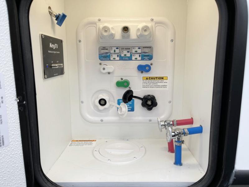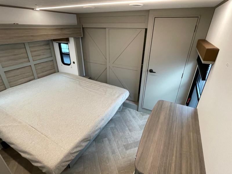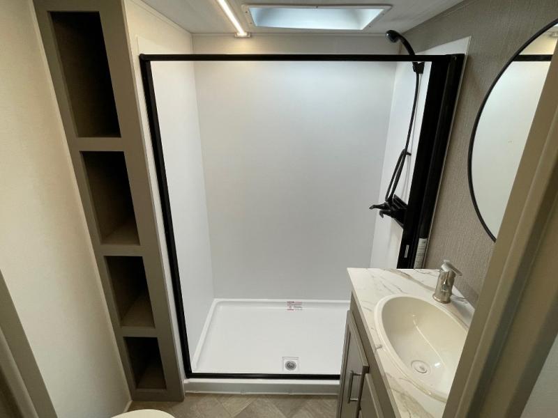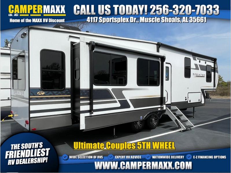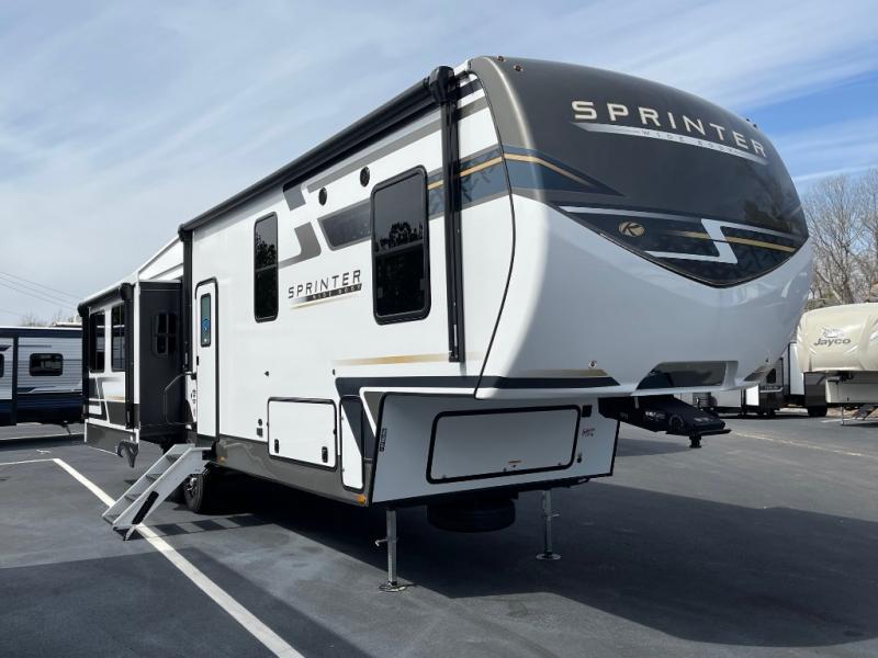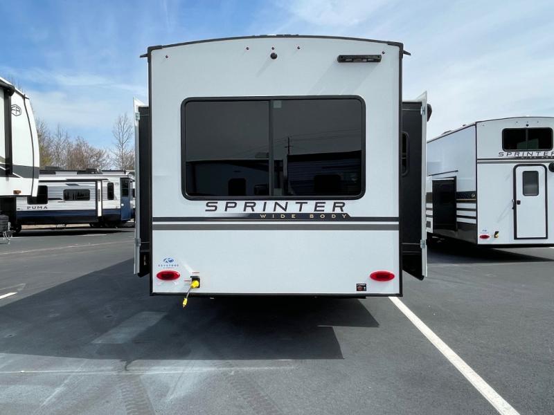 The Sprinter fifth wheels by Keystone feature spacious living areas, plenty of storage, and outstanding towability. Each unit is constructed with 2" aluminum framed and laminated sidewalls, a fully walkable roof, and dual layer insulation to help extend your camping season. The heated pass-through storage includes lockable slam latch baggage doors so you can easily pack your gear, and the one-touch 4-point leveling system features return hookup memory to have you set up in no-time. Head inside to find Congoleum vinyl flooring, Thomas Payne luxury collection furniture, residential style seamless marbled countertops, and an upgraded bedspread to name a few comforts. The Sprinter also includes a Girard tankless on-demand water heater, a central command center, plus a 30k BTU furnace and two A/C units to ensure your comfort!