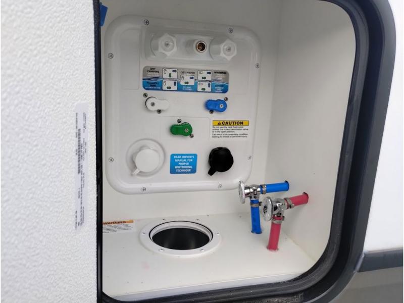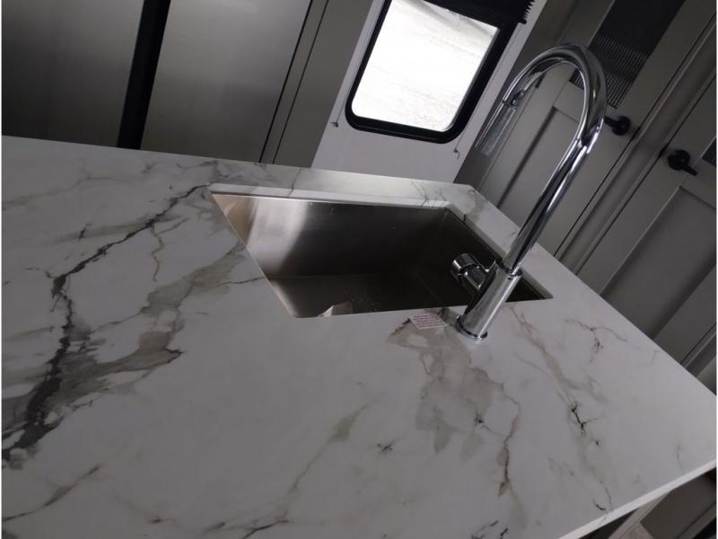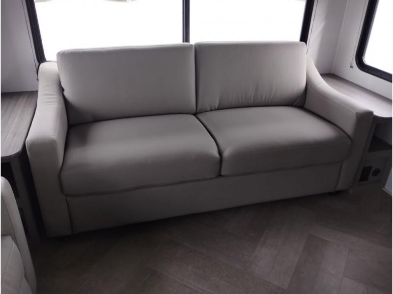 The Sprinter fifth wheels by Keystone feature spacious living areas, plenty of storage, and outstanding towability. Each unit is constructed with 2" aluminum framed and laminated sidewalls, a fully walkable roof, and dual layer insulation to help extend your camping season. The heated pass-through storage includes lockable slam latch baggage doors so you can easily pack your gear, and the one-touch 4-point leveling system features return hookup memory to have you set up in no-time. Head inside to find Congoleum vinyl flooring, Thomas Payne luxury collection furniture, residential style seamless marbled countertops, and an upgraded bedspread to name a few comforts. The Sprinter also includes a Girard tankless on-demand water heater, a central command center, plus a 30k BTU furnace and two A/C units to ensure your comfort!