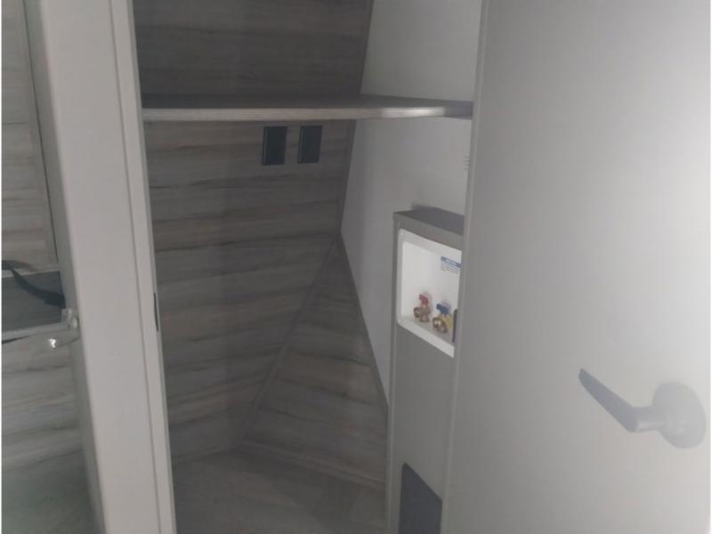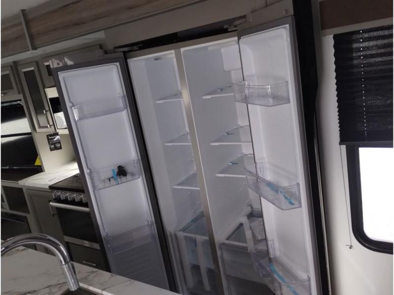 It will be so easy to enjoy camping trips or extended stays in this spacious fifth wheel! There are dual opposing slides in the combined kitchen and living area, giving you plenty of space to relax on the full reclining theater seating across from the fireplace and 50" TV. There is also a desk with drawers and a chair where you can get some work done if needed. The chef of your group will love the 7' kitchen island and double door pantry for dry goods, snacks and more. Your guests can sleep on the rear sofa, while you take the front private bedroom with a king bed slide out. You can keep your things organized in the dresser, wardrobe, and linen closet with stackable washer and dryer prep.