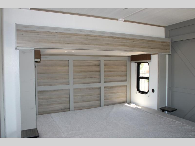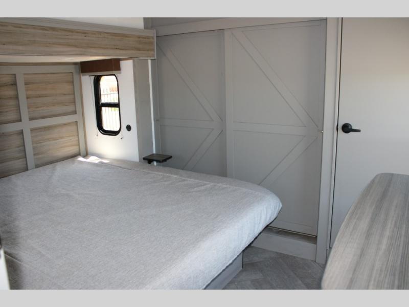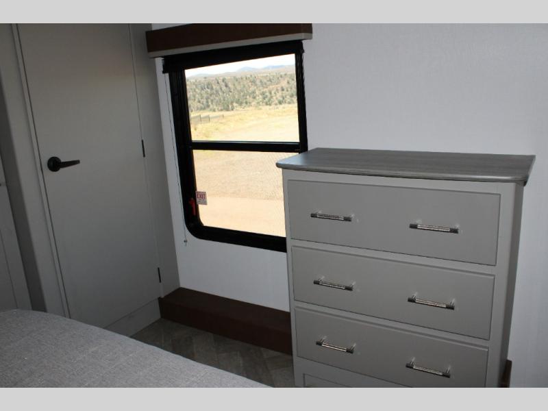 King Bed Slide in a Private Front Bedroom: End your day in total comfort with a spacious king bed, dresser, wardrobe, and linen closet with washer/dryer prep for easy long-term travel.