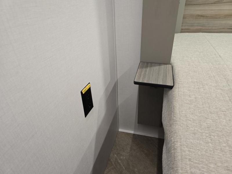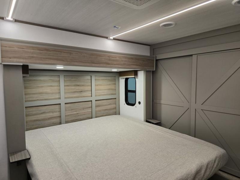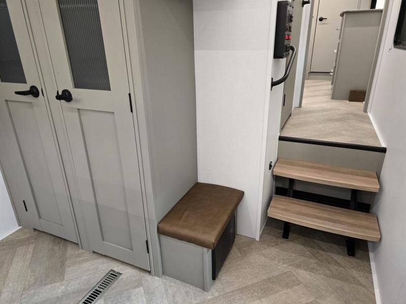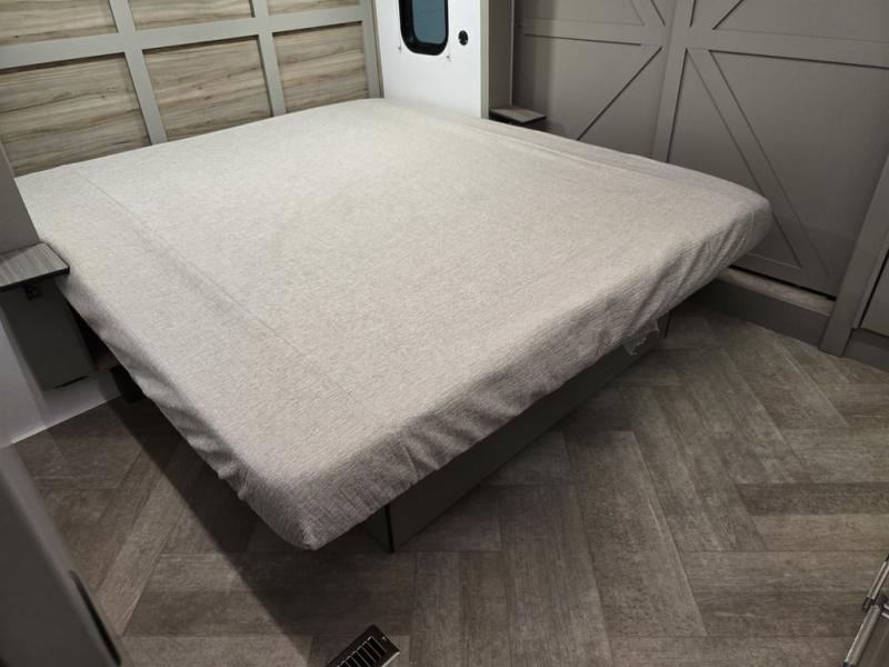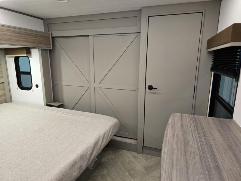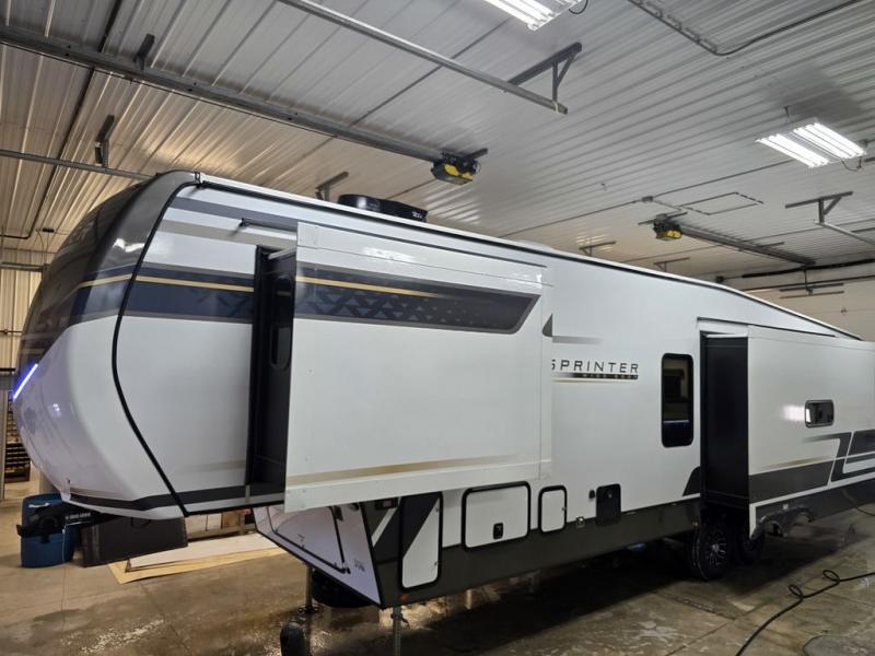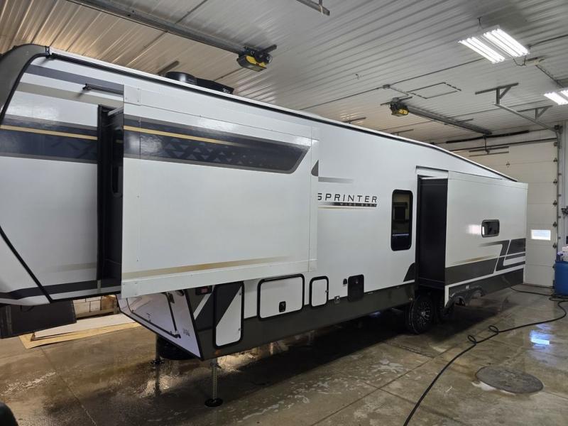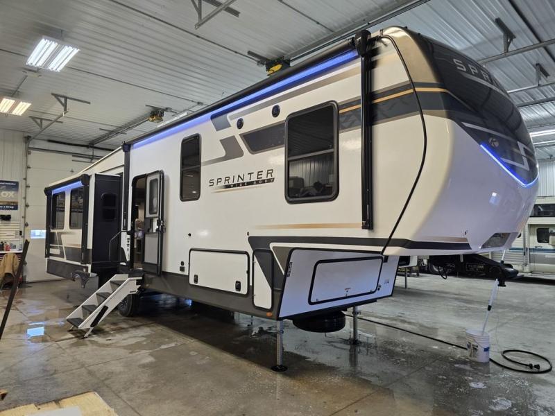 The Sprinter fifth wheels by Keystone feature spacious living areas, plenty of storage, and outstanding towability. Each unit is constructed with 2" aluminum framed and laminated sidewalls, a fully walkable roof, and dual layer insulation to help extend your camping season. The heated pass-through storage includes lockable slam latch baggage doors so you can easily pack your gear, and the one-touch 4-point leveling system features return hookup memory to have you set up in no-time. Head inside to find Congoleum vinyl flooring, Thomas Payne luxury collection furniture, residential style seamless marbled countertops, and an upgraded bedspread to name a few comforts. The Sprinter also includes a Girard tankless on-demand water heater, a central command center, plus a 30k BTU furnace and two A/C units to ensure your comfort!