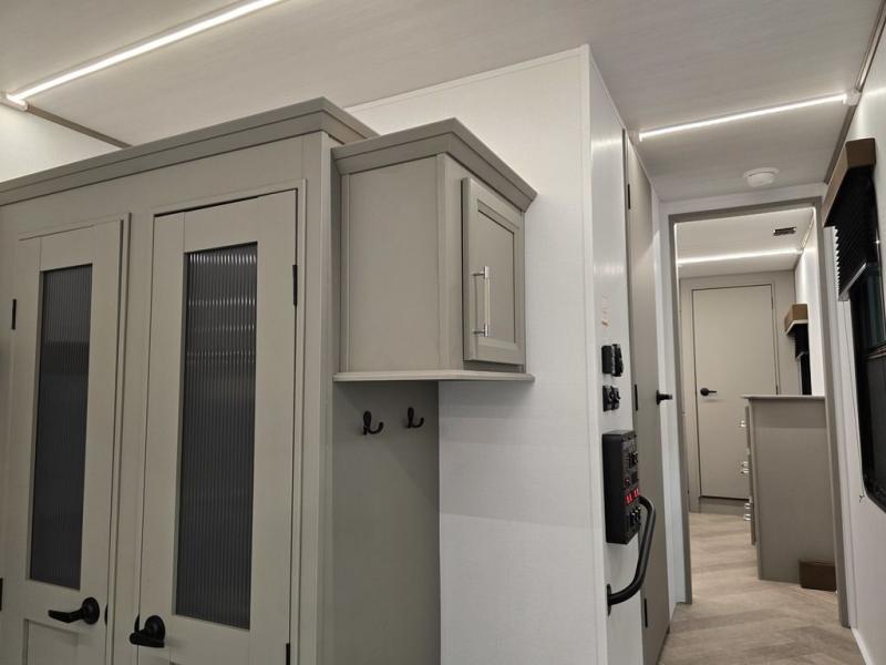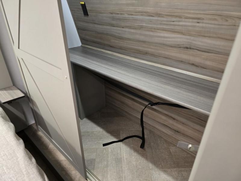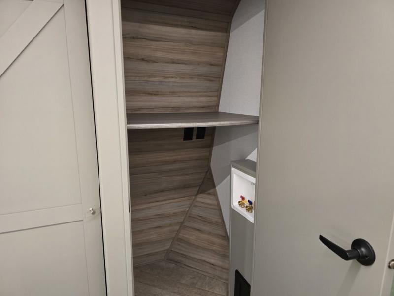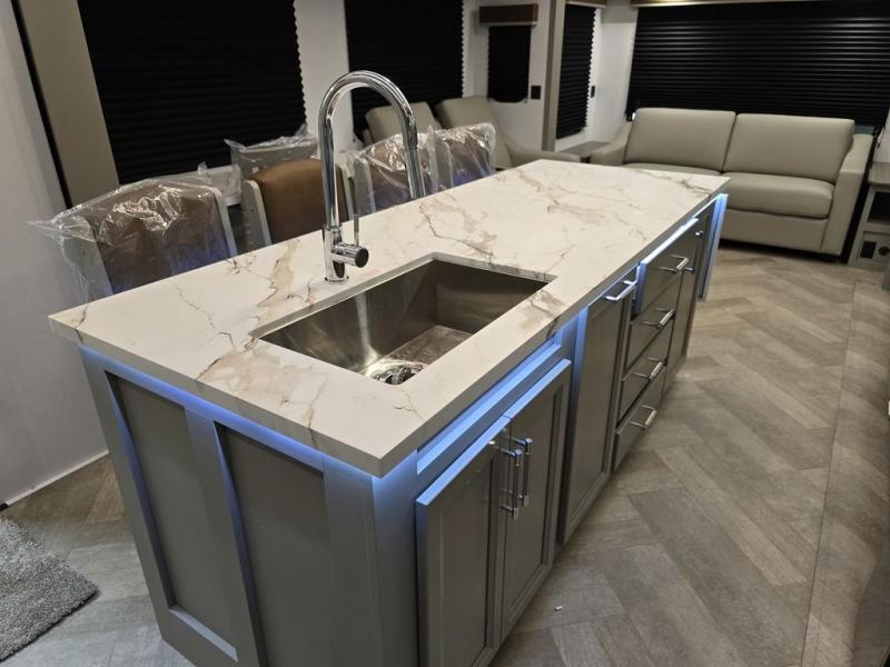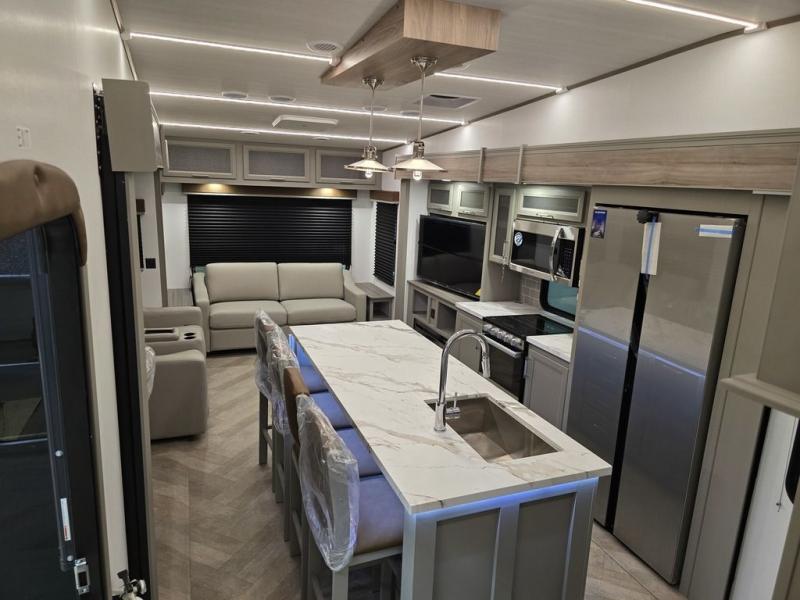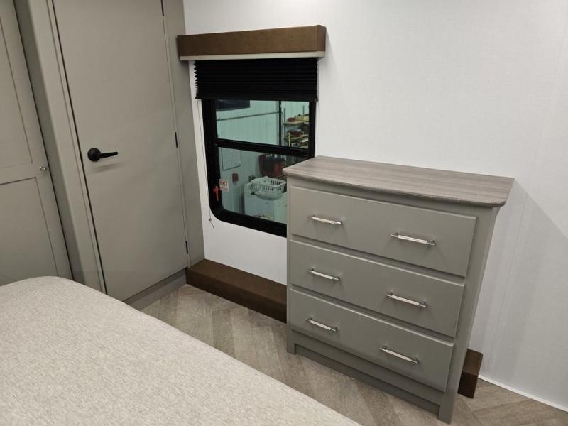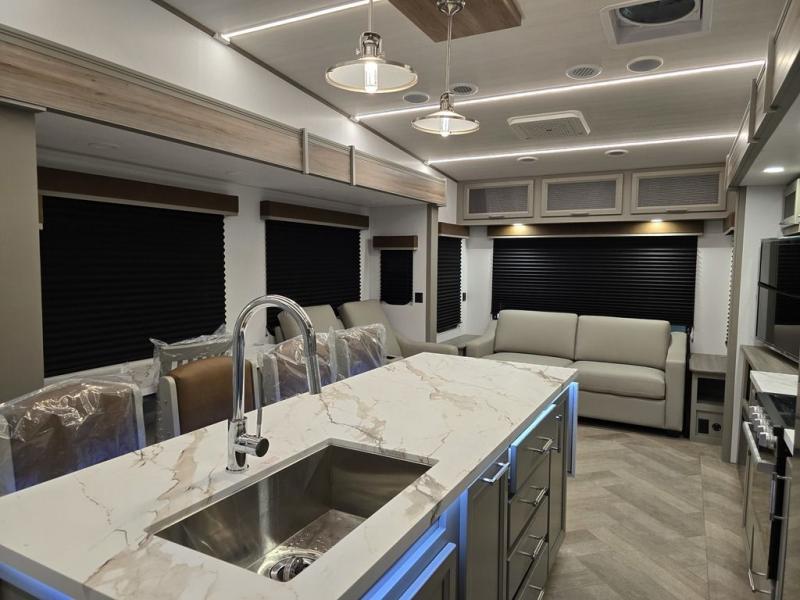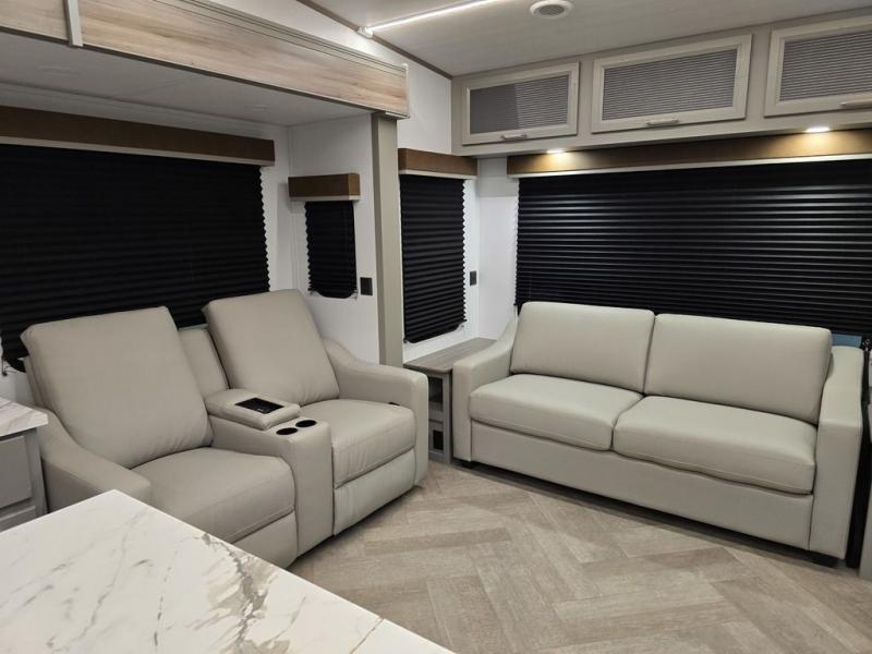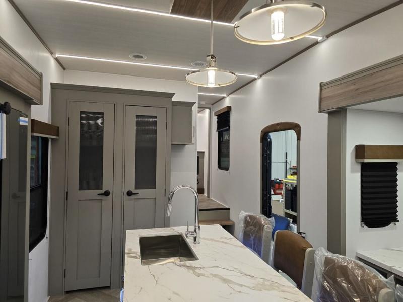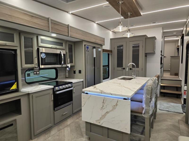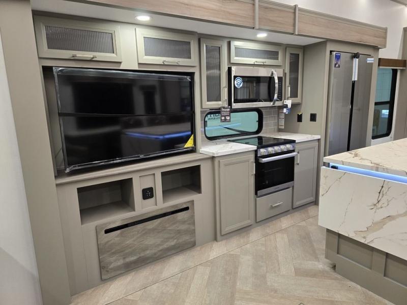 It will be so easy to enjoy camping trips or extended stays in this spacious fifth wheel! There are dual opposing slides in the combined kitchen and living area, giving you plenty of space to relax on the full reclining theater seating across from the fireplace and 50" TV. There is also a desk with drawers and a chair where you can get some work done if needed. The chef of your group will love the 7' kitchen island and double door pantry for dry goods, snacks and more. Your guests can sleep on the rear sofa, while you take the front private bedroom with a king bed slide out. You can keep your things organized in the dresser, wardrobe, and linen closet with stackable washer and dryer prep.