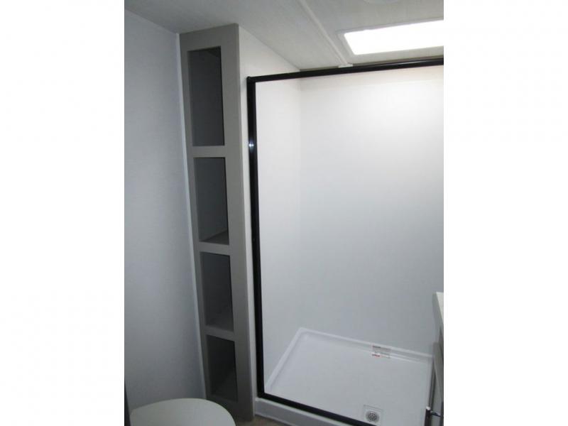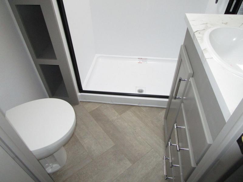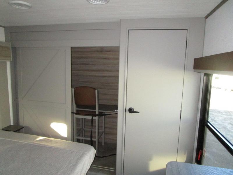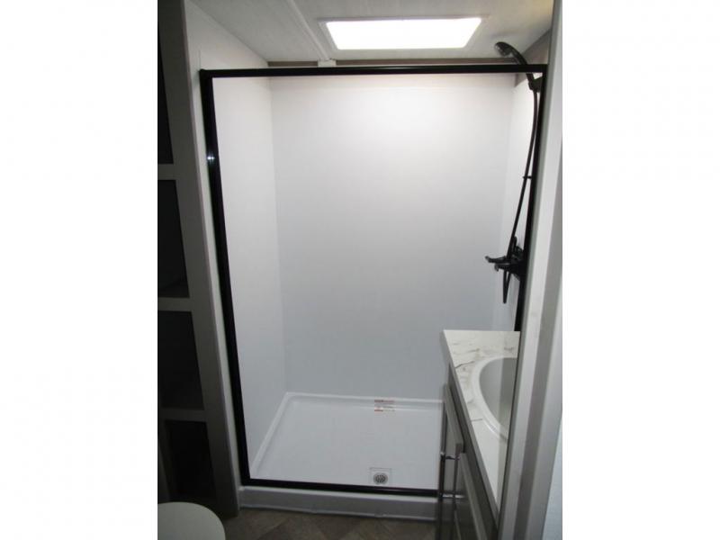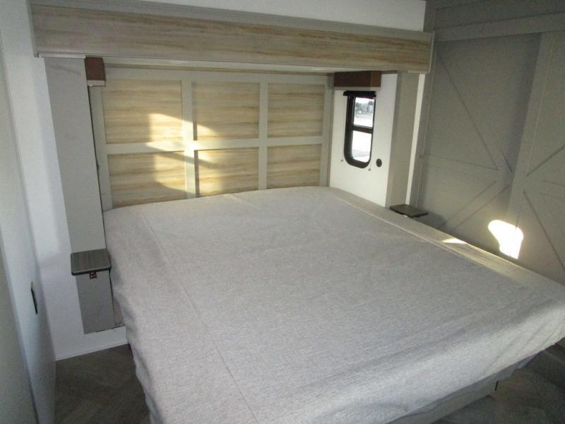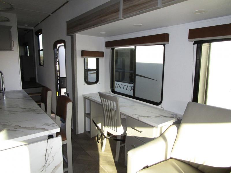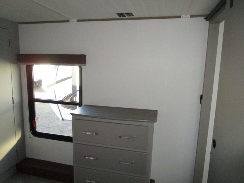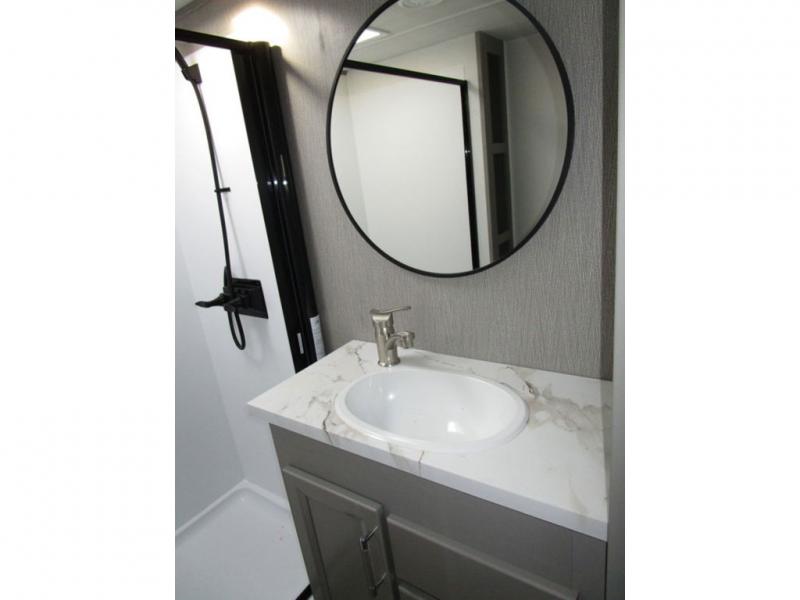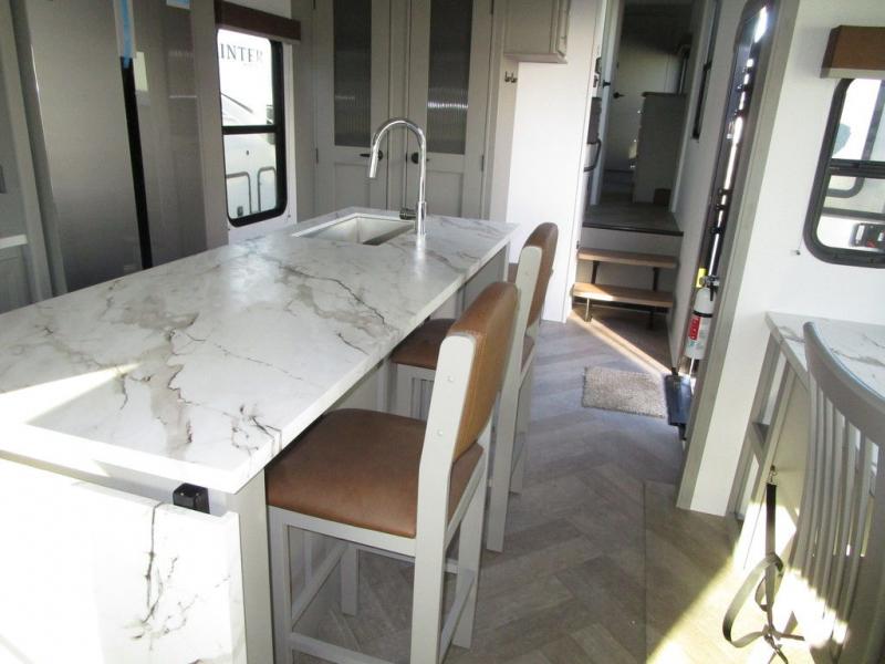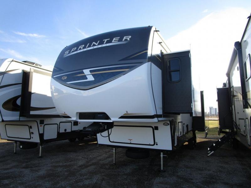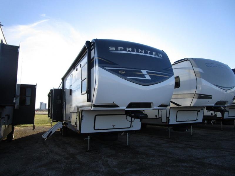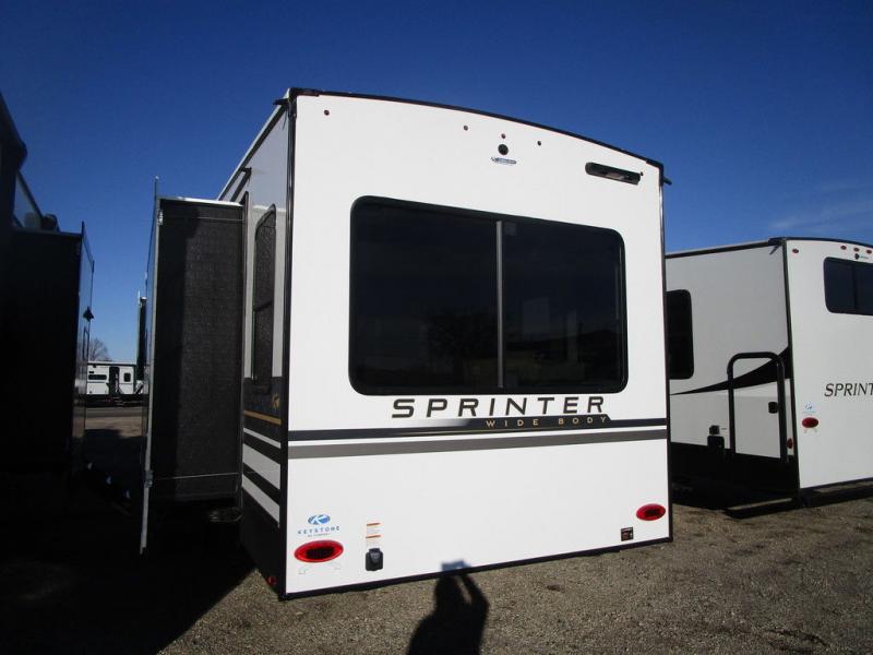 The Sprinter fifth wheels by Keystone feature spacious living areas, plenty of storage, and outstanding towability. Each unit is constructed with 2" aluminum framed and laminated sidewalls, a fully walkable roof, and dual layer insulation to help extend your camping season. The heated pass-through storage includes lockable slam latch baggage doors so you can easily pack your gear, and the one-touch 4-point leveling system features return hookup memory to have you set up in no-time. Head inside to find Congoleum vinyl flooring, Thomas Payne luxury collection furniture, residential style seamless marbled countertops, and an upgraded bedspread to name a few comforts. The Sprinter also includes a Girard tankless on-demand water heater, a central command center, plus a 30k BTU furnace and two A/C units to ensure your comfort!