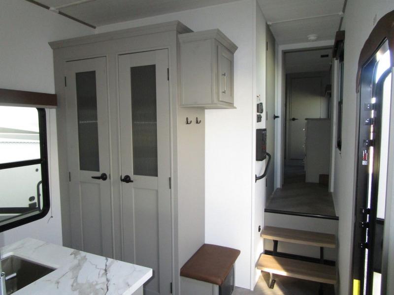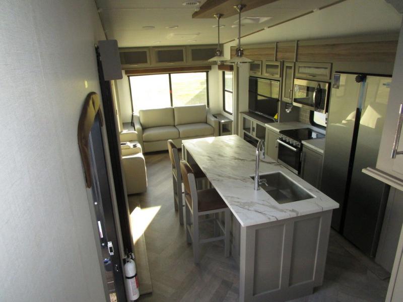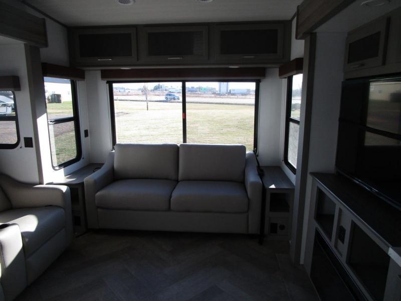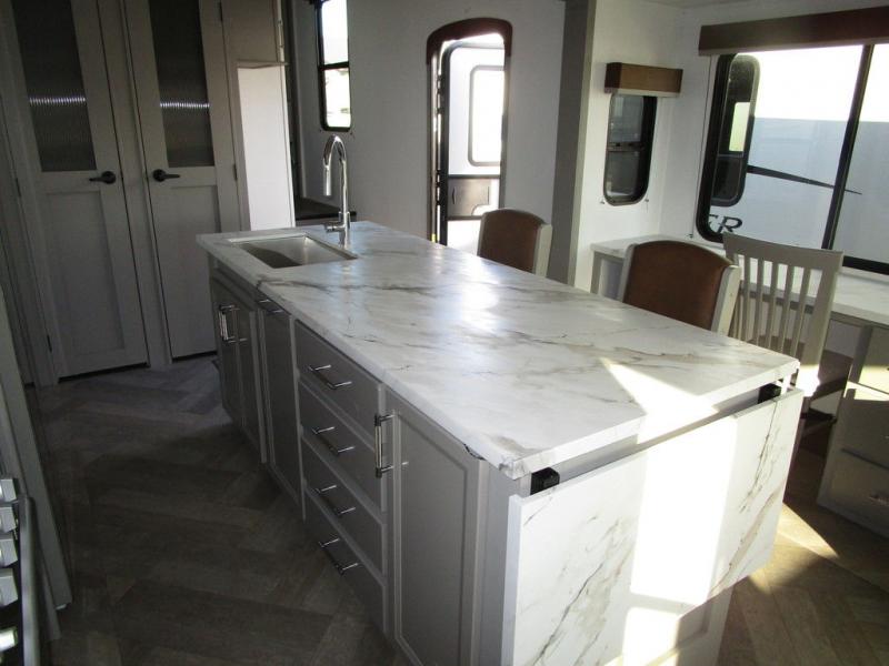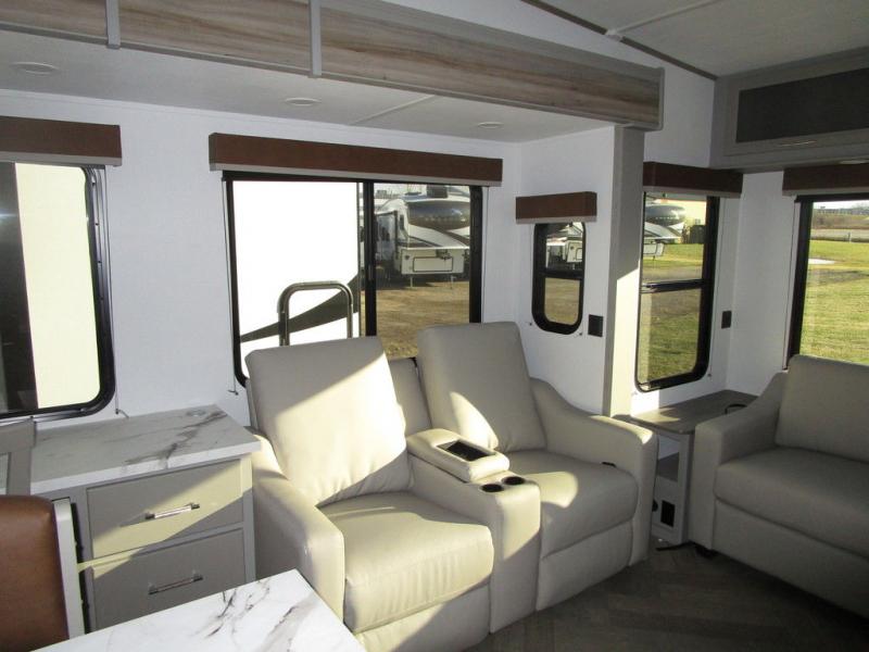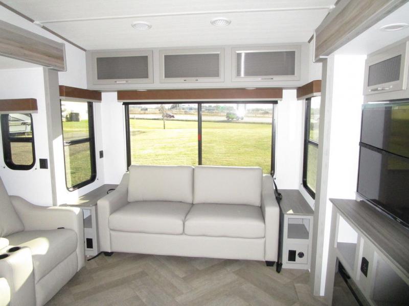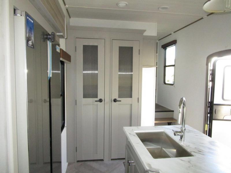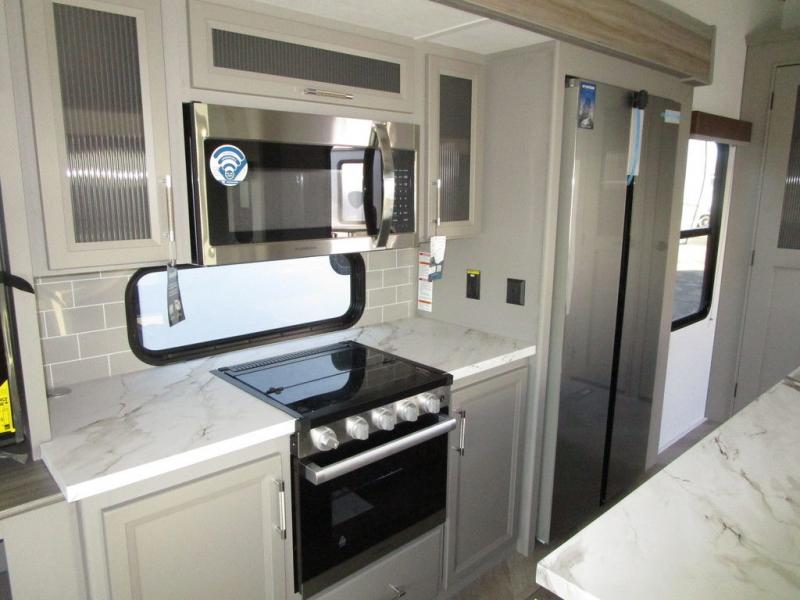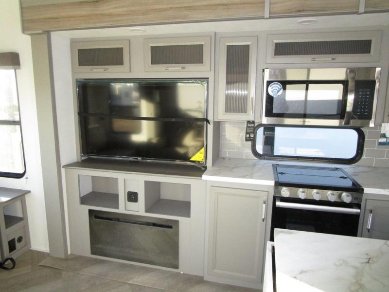 It will be so easy to enjoy camping trips or extended stays in this spacious fifth wheel! There are dual opposing slides in the combined kitchen and living area, giving you plenty of space to relax on the full reclining theater seating across from the fireplace and 50" TV. There is also a desk with drawers and a chair where you can get some work done if needed. The chef of your group will love the 7' kitchen island and double door pantry for dry goods, snacks and more. Your guests can sleep on the rear sofa, while you take the front private bedroom with a king bed slide out. You can keep your things organized in the dresser, wardrobe, and linen closet with stackable washer and dryer prep.