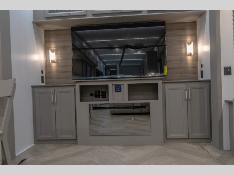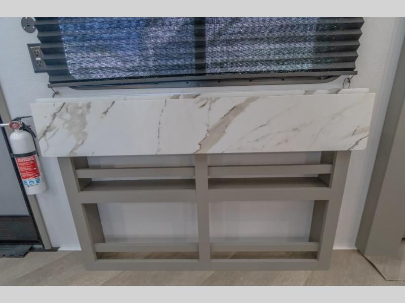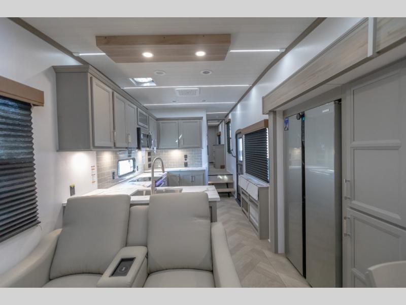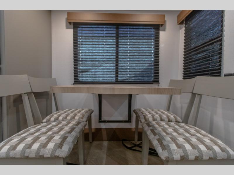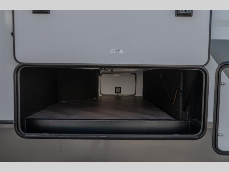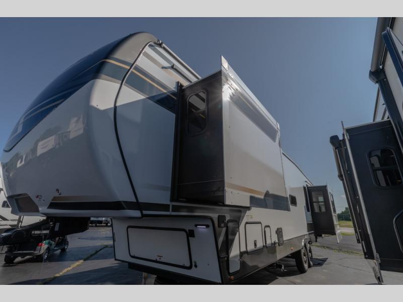 This fifth wheel with a rear den/living room is sure to be a big hit! You can relax on the full reclining theater seating, dine at the free-standing dinette with two chairs, and let guests sleep over on the queen-size tri-fold sofa. There is also a fireplace/heater and an HDTV for movie nights. The middle kitchen includes U-shaped counter space, a 30" stainless steel microwave, and flip-up storage to keep your space tidy. A front private bedroom with a king bed slide out will have you feeling right at home, and there is plenty of storage under the bed, in the wardrobe and dresser, and in the closet with stackable washer and dryer prep.