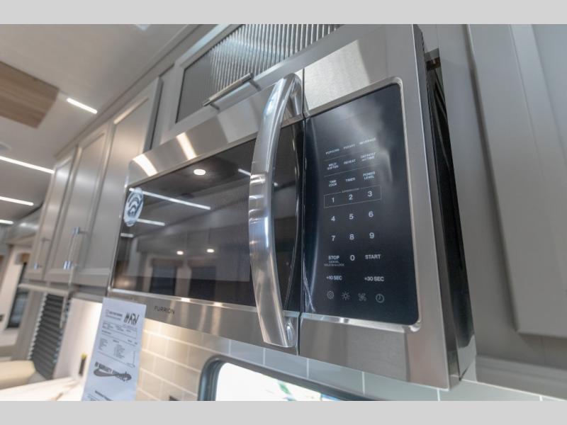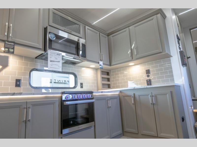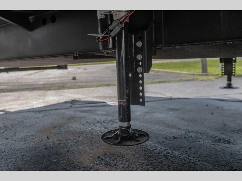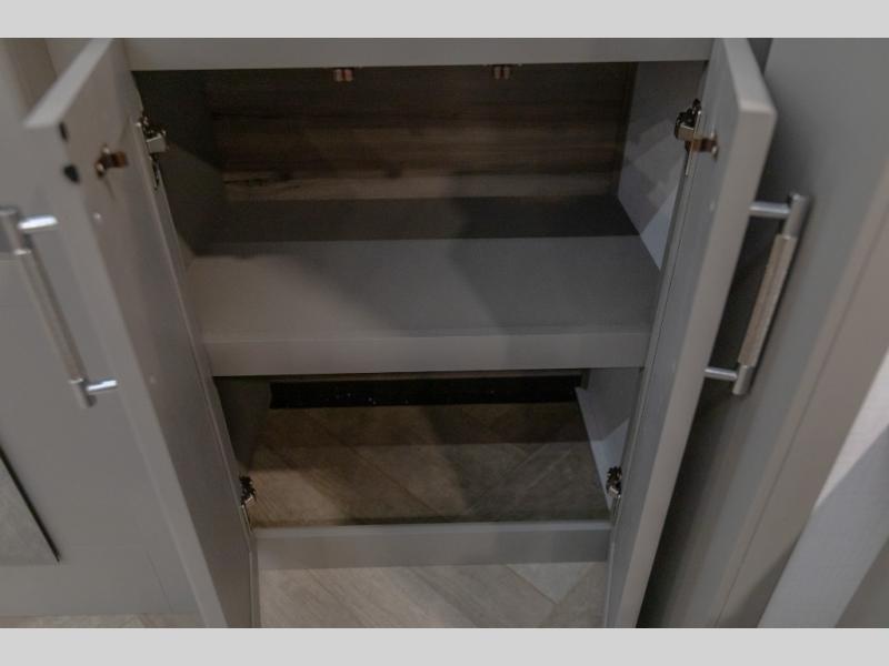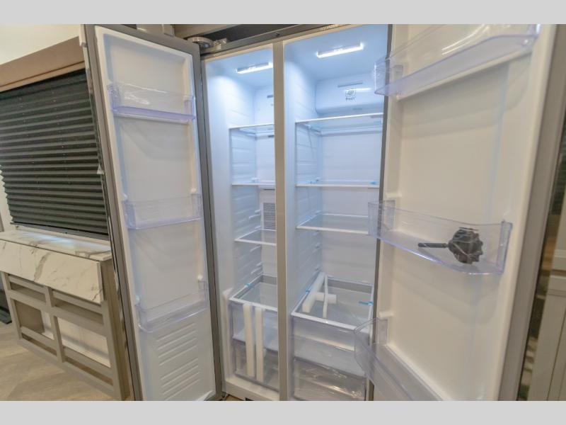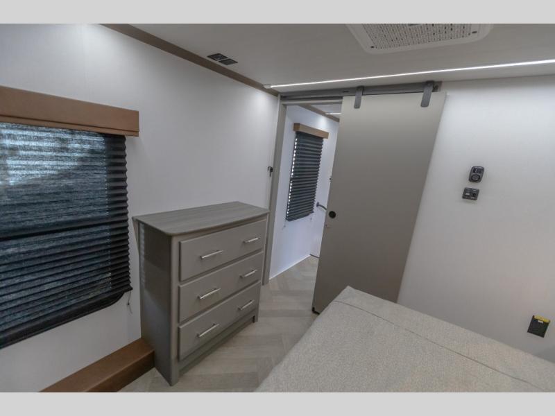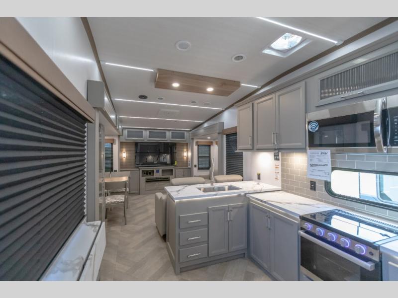 This fifth wheel with a rear den/living room is sure to be a big hit! You can relax on the full reclining theater seating, dine at the free-standing dinette with two chairs, and let guests sleep over on the queen-size tri-fold sofa. There is also a fireplace/heater and an HDTV for movie nights. The middle kitchen includes U-shaped counter space, a 30" stainless steel microwave, and flip-up storage to keep your space tidy. A front private bedroom with a king bed slide out will have you feeling right at home, and there is plenty of storage under the bed, in the wardrobe and dresser, and in the closet with stackable washer and dryer prep.