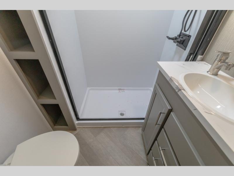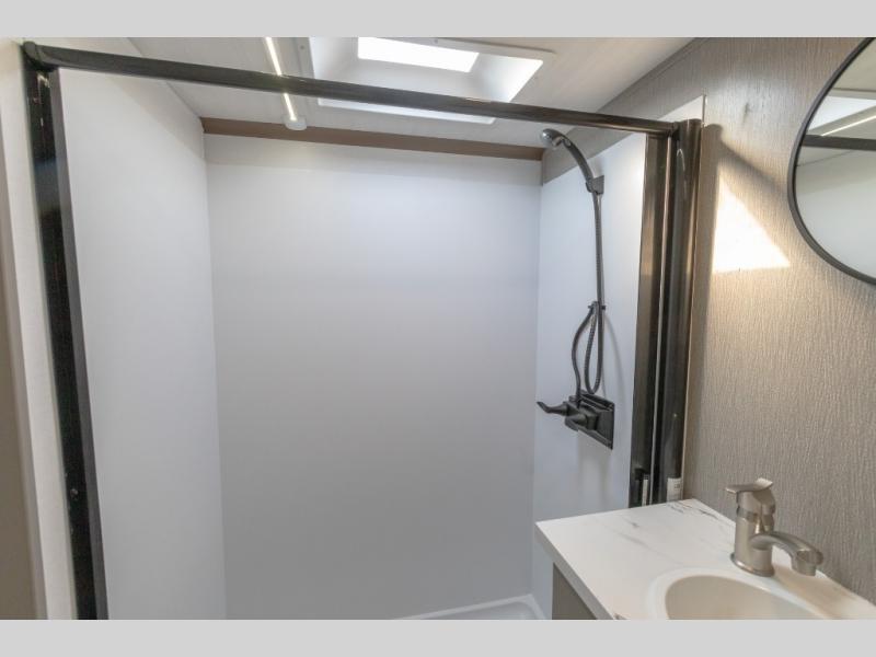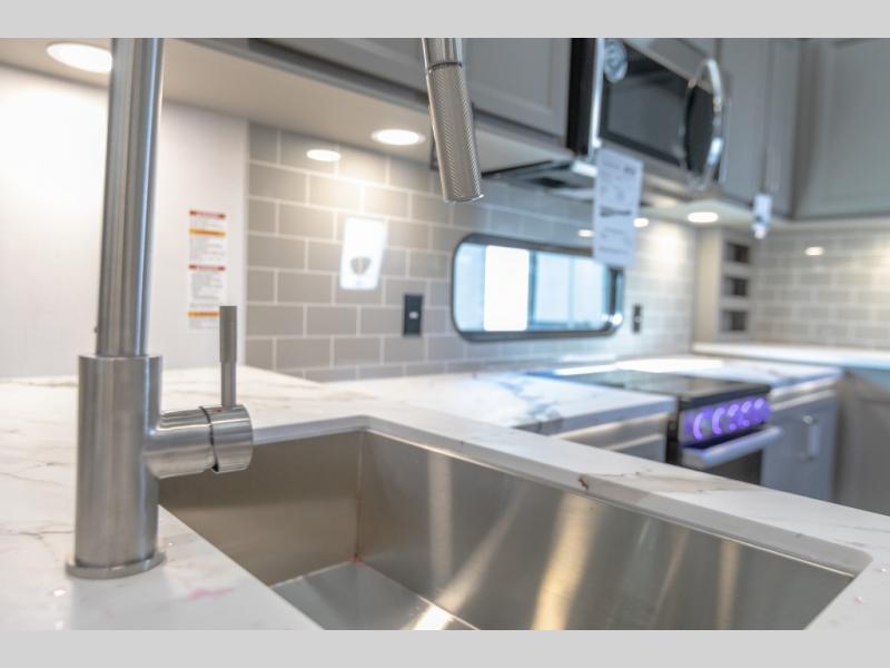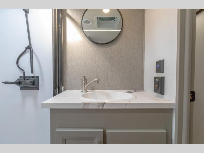 The Sprinter fifth wheels by Keystone feature spacious living areas, plenty of storage, and outstanding towability. Each unit is constructed with 2" aluminum framed and laminated sidewalls, a fully walkable roof, and dual layer insulation to help extend your camping season. The heated pass-through storage includes lockable slam latch baggage doors so you can easily pack your gear, and the one-touch 4-point leveling system features return hookup memory to have you set up in no-time. Head inside to find Congoleum vinyl flooring, Thomas Payne luxury collection furniture, residential style seamless marbled countertops, and an upgraded bedspread to name a few comforts. The Sprinter also includes a Girard tankless on-demand water heater, a central command center, plus a 30k BTU furnace and two A/C units to ensure your comfort!