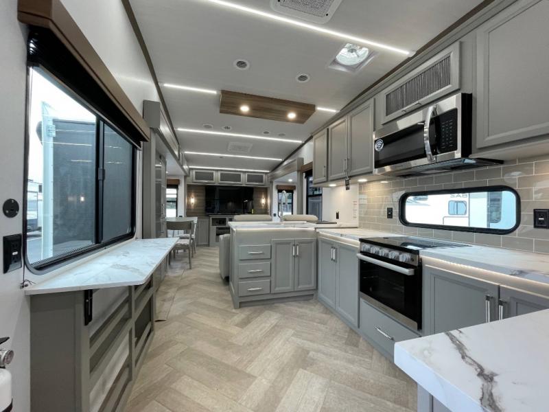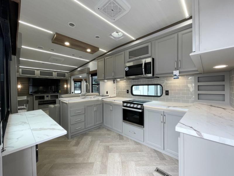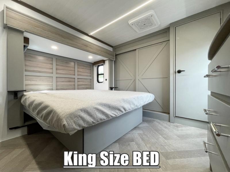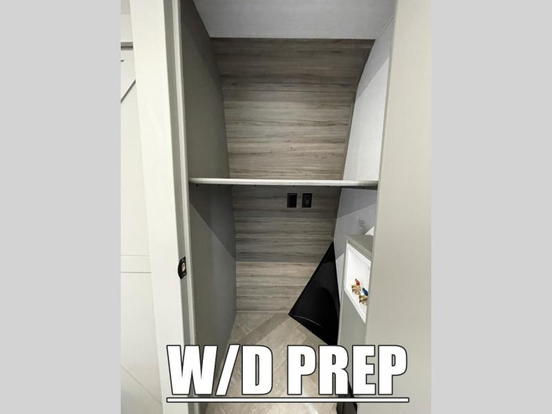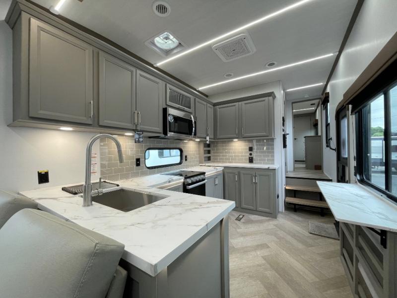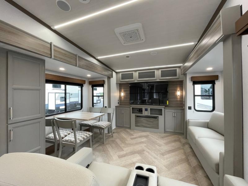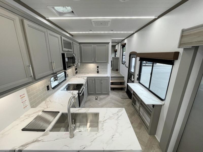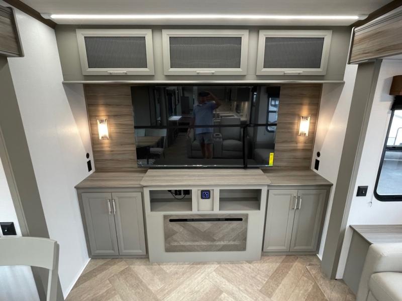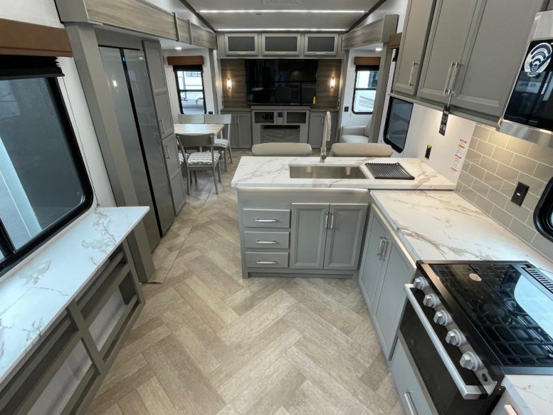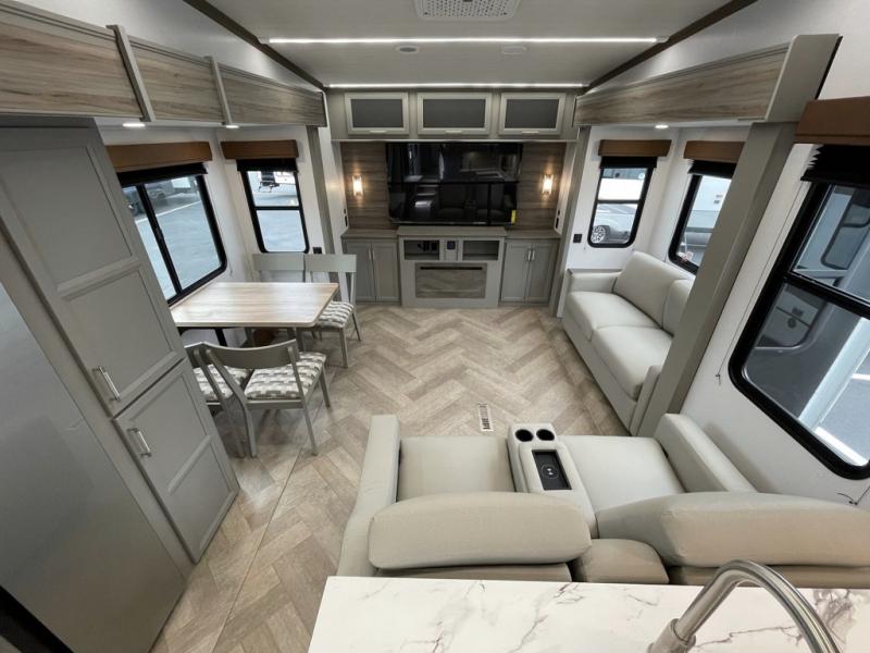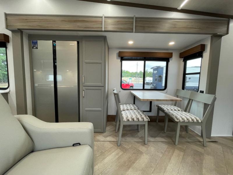 This fifth wheel with a rear den/living room is sure to be a big hit! You can relax on the full reclining theater seating, dine at the free-standing dinette with two chairs, and let guests sleep over on the queen-size tri-fold sofa. There is also a fireplace/heater and an HDTV for movie nights. The middle kitchen includes U-shaped counter space, a 30" stainless steel microwave, and flip-up storage to keep your space tidy. A front private bedroom with a king bed slide out will have you feeling right at home, and there is plenty of storage under the bed, in the wardrobe and dresser, and in the closet with stackable washer and dryer prep.